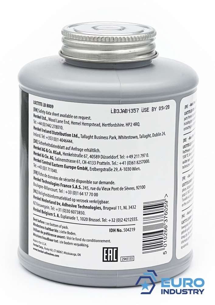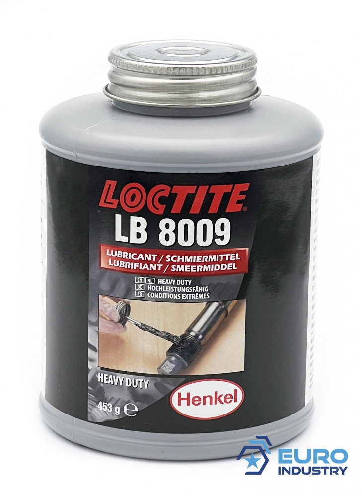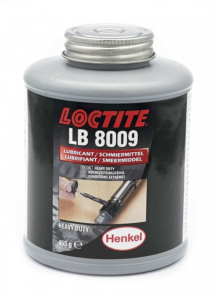 Loctite® LB 8009 Metal-free anti-seize lubricant – IDH 504219LOCTITE® LB 8009 is a metal-free anti-seize lubricant with graphite and calcium fluoride in a brush top form. Resistant to extremely high temperatures up to +1,315°C. It has an NLGI Grade of 1.ApplicationProvides outstanding lubrication to all metals including stainless steel, aluminium and soft metals.CharacteristicsResistant to very high temperatures up to +1,315°CUnique brush topIt has an NLGI grade of 1Metal-freeOutstanding lubrication for all metals including stainless steel, aluminium and soft metals.Technical specifications Appearance Grey paste Cure Non-curing Penetration, ISO 2137, 1/10 mm 270 to 370 Specific Gravity @ 25 °C 1.15 Weight Per Gallon, lbs/gal 9.6 to 10.6 Information on product safety (Manufacturer, Contact)Henkel AG & Co. KGaA, Henkelstr. 67, 40589 Düsseldorf, GERMANY, +49 211 7970, , www.henkel.com