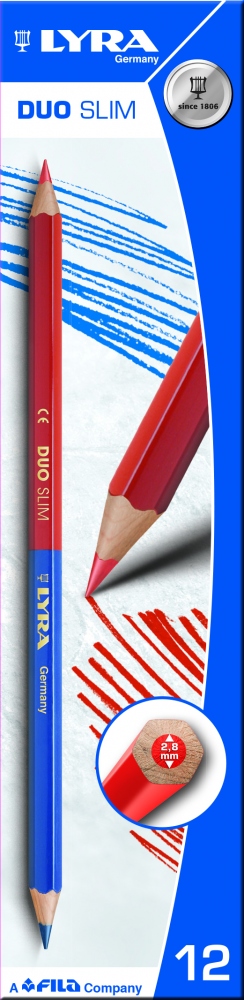 Lyra Duo Slim checking pencil red/blueBoth ends sharpenedCorrections (blue/red) for the installation of hot/cold waterSuitable for marking on dry or wet wood, metal, stone, concrete, plastic, cardboardWood from sustainable forests, norm PEFC and FSCFine markingHexagonal formSize: 178×6.8mm Information on product safety (Manufacturer, Contact)Johann Froescheis Lyra-Bleistift-Fabrik GmbH & Co. KG, Willstätterstrasse 54-56, 90449 Nürnberg, GERMANY, +49 911 6805-0, , www.lyra.de
