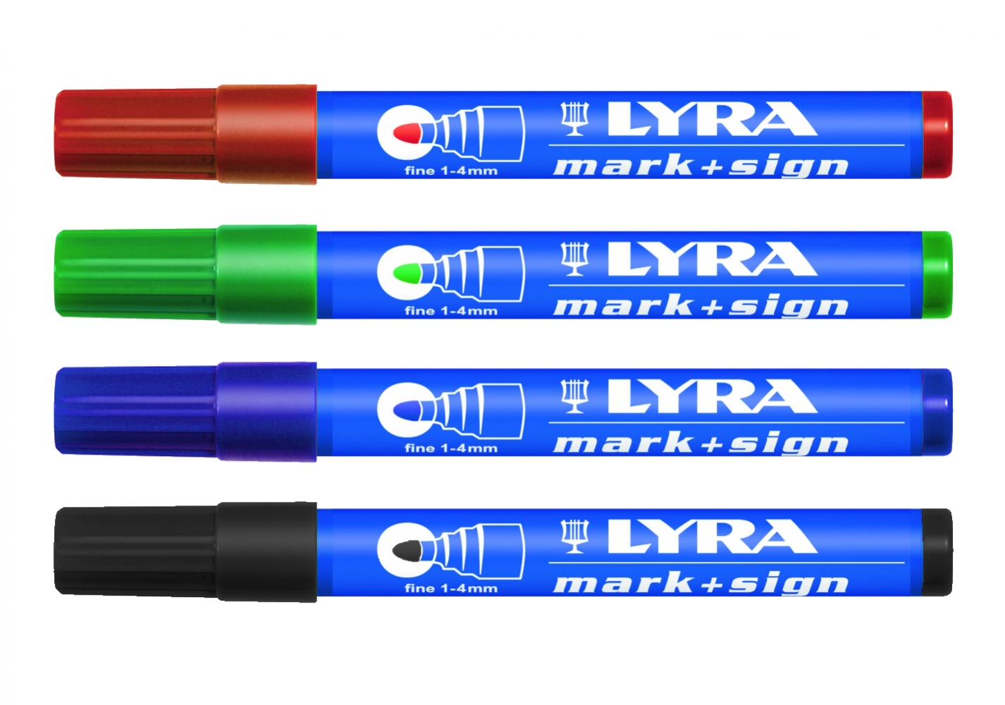 Mark+Sign FINE permanent markerWater-resistantMost suitable for marking on all glossy and porous surfacesFast drying inkDifficult to eraseFree of Xylene and ToluolRound nib: 1-4mmColors: red, blue, green, black Information on product safety (Manufacturer, Contact)Johann Froescheis Lyra-Bleistift-Fabrik GmbH & Co. KG, Willstätterstrasse 54-56, 90449 Nürnberg, GERMANY, +49 911 6805-0, , www.lyra.de