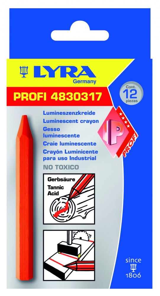 Luminescent marking crayon for optical reading instrumentsWrite on freshly cut wood which is processed before dryingAlso suitable for metal, stone, concrete, plastic and tilesHexagonal shapeUnwrappedSize: 120x12mmColor: neon red Information on product safety (Manufacturer, Contact)Johann Froescheis Lyra-Bleistift-Fabrik GmbH & Co. KG, Willstätterstrasse 54-56, 90449 Nürnberg, GERMANY, +49 911 6805-0, , www.lyra.de