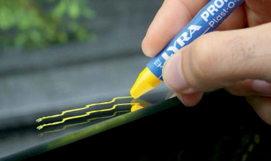 Lyra PLAST-O-GLAS crayon for professional useMost suitable for marking on glossy surfacesFor marking on smooth surfaces, wood, stone, metal, glass, plastic, rubber, textiles, paper, etc.Easy to removePaper-wrapped to keep fingers cleanSize: 90×9,5mmColors: blue, white, yellow, green, red and blackSuitable for crayon holder Information on product safety (Manufacturer, Contact)Johann Froescheis Lyra-Bleistift-Fabrik GmbH & Co. KG, Willstätterstrasse 54-56, 90449 Nürnberg, GERMANY, +49 911 6805-0, , www.lyra.de