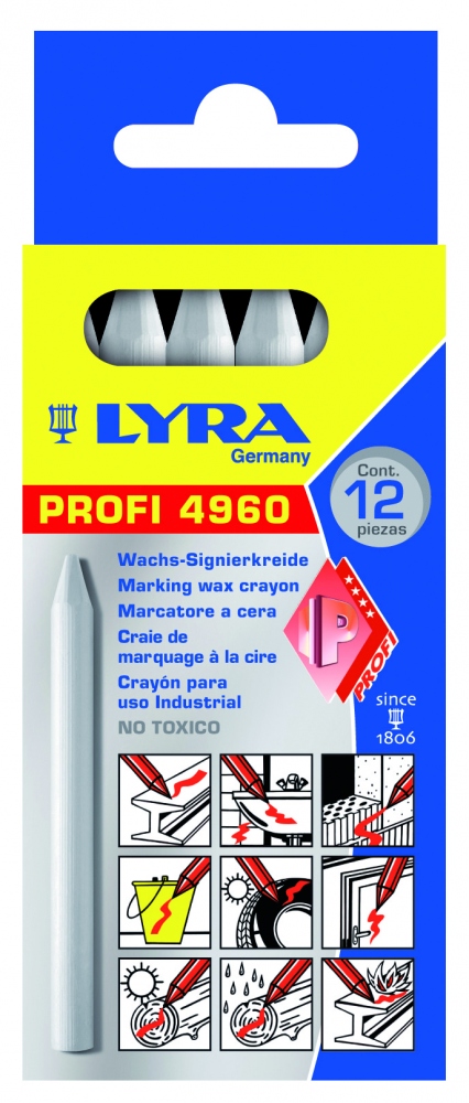 Lyra PROFI 4960 wax crayonFor professional useSuitable for marking on dry or wet wood, metal, stone, concrete, dry tires, glass, plastic tileUnwrappedRound shapeSize: 100×8.5mmColors available: white, blue, yellow, black, red and greenSuitable for Crayon Holder Information on product safety (Manufacturer, Contact)Johann Froescheis Lyra-Bleistift-Fabrik GmbH & Co. KG, Willstätterstrasse 54-56, 90449 Nürnberg, GERMANY, +49 911 6805-0, , www.lyra.de
