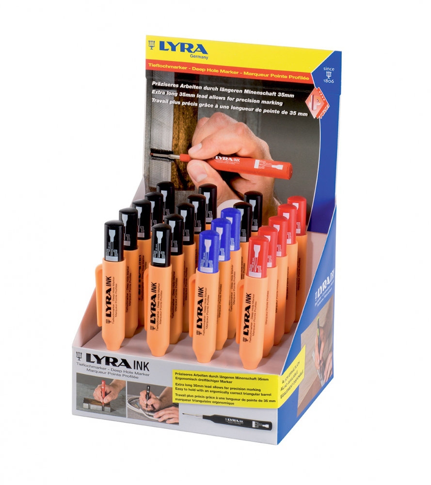 Lyra Ink Display 20 markers (12x black, 5x red and 3x blue)Deep-hole markers for holes and hard to reach placesPermanent inkMore precise work by longer mine shaft (35 mm)Suitable for 2,5mm wide and 20mm long holesMarks on all surfaces (wood, metal, plastic, glass, ceramic, etc.)Practical protective cap with strong clipErgonomic shapeWater-proof, for all dry surfacesSizes: 167x152x153mmDisplay includes12x LYRA INK Black ()5x LYRA INK red ()3x LYRA INK blue () Information on product safety (Manufacturer, Contact)Johann Froescheis Lyra-Bleistift-Fabrik GmbH & Co. KG, Willstätterstrasse 54-56, 90449 Nürnberg, GERMANY, +49 911 6805-0, , www.lyra.de