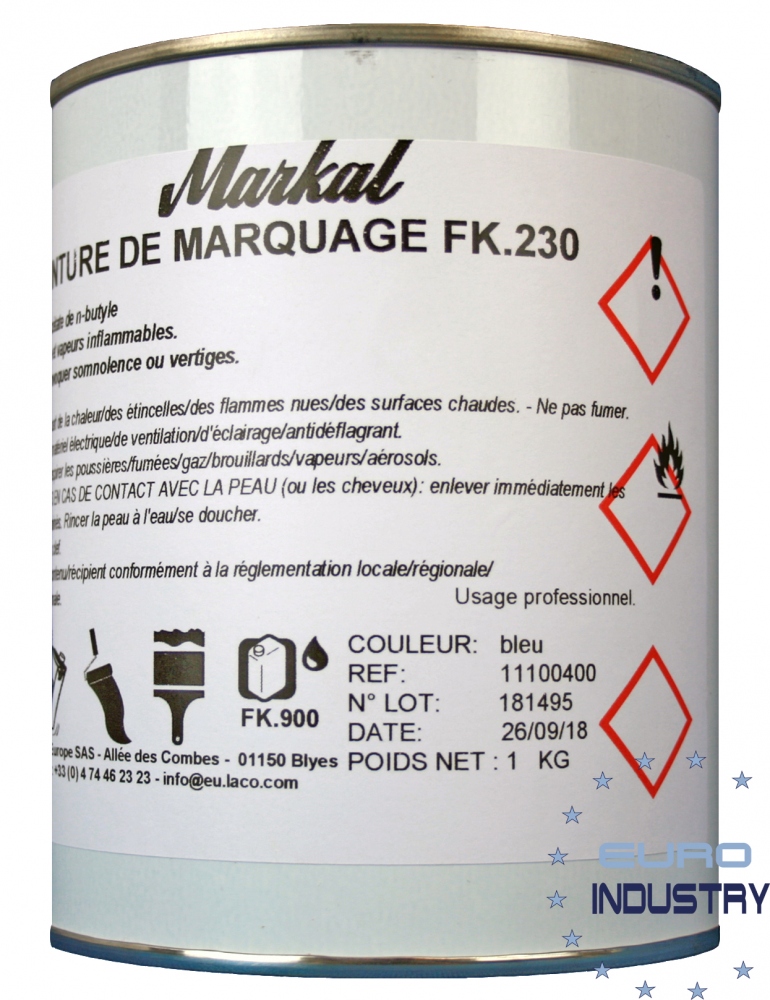 Marking paint for all kind of surfacesResist to UV and weather conditionsContent: 1kgMaterial safety data sheet FK.230 here to downloadSignal word DangerHazard-determining components for labeling:n-butyl acetateHazard statementsH226 Flammable liquid and vapor.H336 May cause drowsiness or dizziness.Precautionary statementsP210 Keep away from heat/sparks/open flames/hot surfaces. No smoking.P241 Use explosion-proof electrical equipment/ventilation systems/lighting.P261 Avoid breathing dust/fume/gas/mist/vapours/spray.P303+P361+P353 IF ON SKIN (or hair): Remove/take off immediately all contaminated clothing. Rinse skin with water/shower.P405 Store locked up.P501 Dispose of contents/container in accordance with local/regional/national/international regulations.Labelling of packaging with a content of not more than 125 mlHazard pictograms Information on product safety (Manufacturer, Contact)LA-CO Industries Europe S.A.S., 465 All. des Combes, 01150 Blyes, FRANCE, +33 4 74 46 23 23, . www.lacoindustries.com