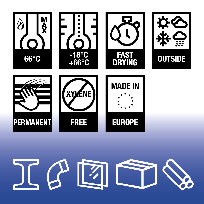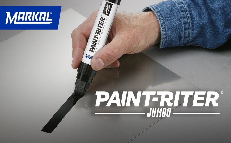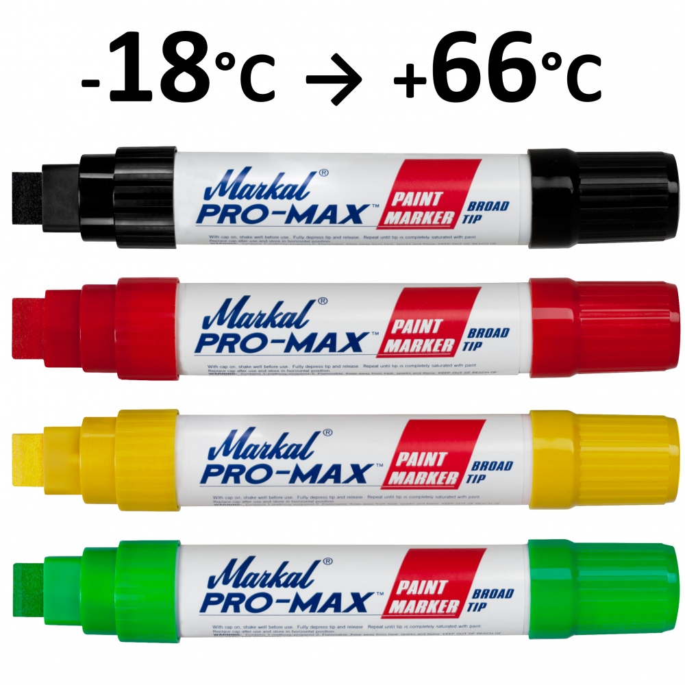 Markal PRO-MAX® Jumbo is a liquid paint marker with an extra-large tip to provide the biggest and most highly-visible marks.The wear-, water- and weather-resistant paint dries quickly to leave bold, easy-to-read marks and is safe for almost any surface.For a long lasting marking.The low odorous paint and harmful solvent free paint is opaque and perfectly visible even on dark surfaces.Lightfast, water-resistant.Writes on most surfaces including plastic, metal, glass, paper and rubber.Resistant to UV and bad weather conditions.Mark’s width: 5 – 15 mm.Use by temperature: -18°C à 66°C (de 0°F à 150°F)Colors: white, yellow, red, blue, green, orange, grey, purple, pink, brownINDUSTRY USESIndustrial manufacturingAutomotive and other transportationSignageShipping supplyConstructionSURFACE USESSteel and IronPlasticCardboardGlassPipes and tubes2. GHS Label elements, including precautionary statementsGHS US labellingHazard pictograms (GHS) :