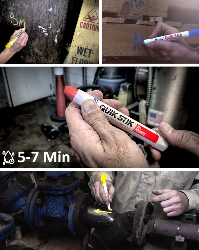 Fast-drying permanent paint marker for most surfacesSmooth-marking, fast-drying paint marks dry in 5-7 minutesBright, bold, fade resistant colorsMore marks for the money, 20% longer than other brandsPlastic holder with self-storing cap prevents breakage, keeps hands and clothing cleanStick advances by turning twist-up knobMarks on virtually any surface, mtal, glass, plastic, wood, cardboard, paper, etc.Marking range: -18 °C to 200 °C (0 °F to 392 °F)Colors: fluorescent yellow, fluorescent green, fluorescent pink, fluorescent orange Industry uses: Metal fabricationAutomotive aftermarketConstructionWeldingIndustrial process pipingShipping supplySurface uses:Pipes and tubesGlassSteel and ironCeramicLumber and timberConcrete and stoneRubber and tiresPlasticHazards (CLP)Signal word: WarningHazard statements (H-phrases)H315 – Causes skin irritation.H319 – Causes serious eye irritation.Precautionary statements (P-phrases)Prevention:P264 – Wash hands thoroughly after handling.P280 – Wear protective gloves/protective clothing/eye protection/face protection/hearing protection.Response:P302+P352 – IF ON SKIN: Wash with plenty of water.P305+P351+P338 – IF IN EYES: Rinse cautiously with water for several minutes. Remove contact lenses, if present and easy to do. Continue rinsing.P321 – Specific treatment (see First aid measures on this label).P332+P313 – If skin irritation occurs: Get medical advice/attention.P337+P313 – If eye irritation persists: Get medical advice/attention.P362+P364 – Take off contaminated clothing and wash it before reuse.Additional relevant information0.2% of the mixture consists of ingredient(s) of unknown acute toxicity (oral, dermal, inhalation).Contains 0.2% of components with unknown hazards to the aquatic environment. Information on product safety (Manufacturer, Contact)LA-CO Industries Europe S.A.S., 465 All. des Combes, 01150 Blyes, FRANCE, +33 4 74 46 23 23, . www.lacoindustries.com