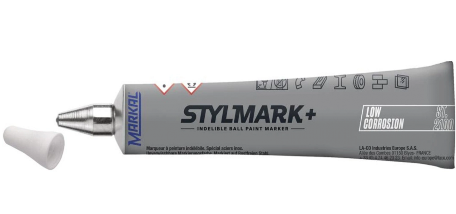 Indelebile paint marker for stainless steel ST.2100. The paint of the ball point metal marker ST.2100 is low chloride, making it safe for marking stainless steel.When remove, the marks will leave no trace on steel, and won’t affect a galvanazing process or a top coat.The paint is opaque, covering and bright.The paint is indelible after drying.The paint of the ball point metall marker ST.2100 can only be erased with a special solvents or abrasive tools.Can be used on surfaces even rough, dirty, rusted…Water and U.V. Resistant.Paint information:Quantity of all halogens: (Chloride, fluoride, bromide, iodine) < 200 ppmQuantity of sulphur: < 200 ppmApplication:Hold the tube straight during marking.Hold the point with ball against surface to mark and press at the same time on the tube.Do not roll the tube. Risk of fissures.