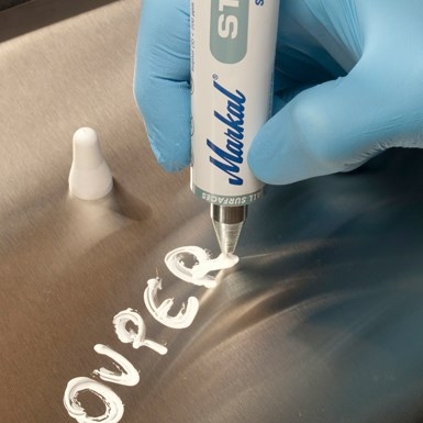 Markal ST.2100 PMUC is a unique metal-ball tip marker certified for nuclear plants in France. Each marker is traceable to a manufactured batch number on the PMUC certificate that is required and controlled by EDF. Its 6 colors of low sulfur, low chloride paint is safe for use on stainless steel, alloy, and other super alloy metals where corrosion resistance is a requirement. Marking range -20°C to 70°CMark temperature resistance: 200°C Surface usesStainless steelAlloy and super alloy metalsAlloy metalsCharacteristicsOfficial PMUC certification: – 200 ppm total halogens (chlorides, fluoride, bromide, iodine – 200 ppm sulfurEach marker is delivered with a batch number and an official certificate with the product shipmentSafe for use on stainless steel and other alloy metals where corrosion resistance is a requirement3 mm, durable steel ball tip marks with indelible paint for long marking life5 bold, bright paint colors are weather-, water-, and UV-resistantUnique paint designed not to drip on vertical or overhead surfacesField of application Nuclear-power generationOther power generation facilitiesAviation and aerospaceShip building and repairOil and gasWeldingMilitaryIndustrial manufacturingLabelling according to Regulation (EC) No. 1272/2008 [CLP]Hazard pictograms (CLP) :