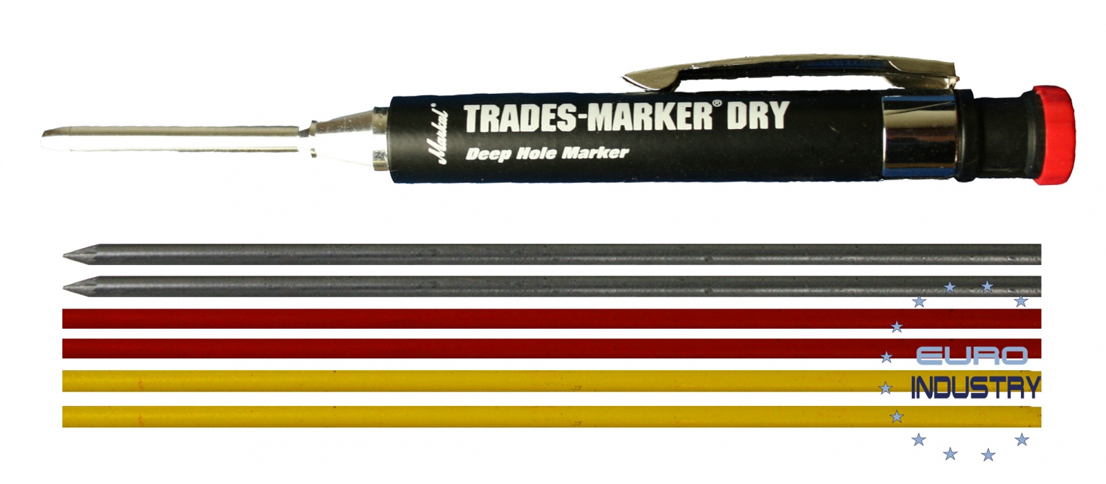 Starter Pack including 1x Trades Marker Dry & 1x colored refills packMarks and writes on all materials + surfaces also on dusty, rough, oily, wet and dark surfaces.Refill leads in different colours 3 standard-colours , 2,8 mm DIA (red and yellow are sensitive against high temperatures).Big protective cap with strong clip in signal colour, can be handled with one hand, does not fall out.Automatic lead support, stainless steel tube 1 x push = 2 mm lead support, easy refill: remove push button, fill in new lead, replace push button.Sharpener built into the front of the cap easy to handle, always reachable.Can be wiped off on glossy surfaces with wet tissue.Delievered with 6 refills: 2 graphit + 2 yellow + 2 red Information on product safety (Manufacturer, Contact)LA-CO Industries Europe S.A.S., 465 All. des Combes, 01150 Blyes, FRANCE, +33 4 74 46 23 23, . www.lacoindustries.com