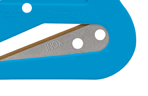 The SECUMAX PLASTICUT is different from the other products in our range but only in the detail. But you know: that’s what often matters most. This flexible disposable cutter is best used for thin film and paper. Due to its width of just 3 mm, cutting protective film stretched over a thin gulley as between door and pillar on a new car is also possible. The blade is made of stainless steel, the cutting edge is TiN coated. And: the SECUMAX PLASTICUT is perforated – in case you want to add additional fittings later on. DetailsNo blade change: The SECUMAX PLASTICUT is a disposable safety knife. Since you do not have to change the blade, neither you nor your staff can come into contact with it. An additional benefit as far as safety is concerned.Nose for piercing: You do not have to put away the SECUMAX PLASTICUT so easily. That’s because it is comfortable, light and handy. Its nose is not flattened downwards, but is pointed at the top. Ideal for piercing into cutting material.Stainless steel blade: Not all film cutters are fitted with a stainless steel blade. The SECUMAX PLASTICUT is an exception. What’s more: even its cutting edge is TiN-coated. Both increase the value and durability of your cutting tool.Protected goods: The quality blade is safely embedded between the nose and the handle. So it only cuts what you really want to cut. And there is no risk to your goods while doing so.To protect your fingers: The perforation in the handle has a very specific purpose: You can attach an additional finger protection bracket here. The hand that is cutting will then be able to grip better. Better safe than sorry.Product informationMeasurements (L x W x H): 75 x 3 x 44 mmWeight product: 6.3 gCutting depth: 4 mmBasic material: Plastic Technical featuresMain cutting materials Information on product safety (Manufacturer, Contact)MARTOR KG, Lindgesfeld 28, 42653 Solingen, GERMANY, +49 212 73870-0, , www.martor.com