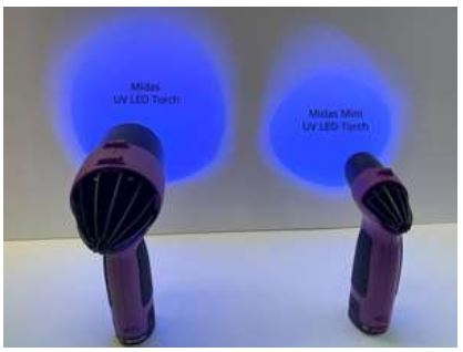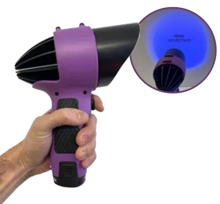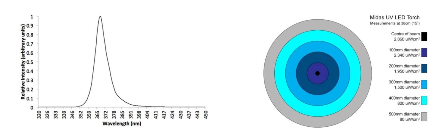 Midas is a powerful, rechargeable, high-intensity UV LED torch designed for professional UV-A inspections and compliant with international standards.Professional applicationsCrack detection, leak identificationHydrocarbon analysisClearcoat inspection, security markings, and moreFeaturesHigh-performance UV-A lamp (365 nm) for accurate fluorescence inspectionsCompact and lightweight (0.9 kg), ideal for portable usePowered by a rechargeable 12V Bosch battery (incl. spare battery and charger)UV-A output: >2,800 µW/cm² at a 38 cm distanceDetailed beam distribution with irradiance levels measured up to 500 mm diameterFlashing UV LEDs to indicate low battery when output drops below 1,000 µW/cm² (approx. 2 hours of continuous use)Easy access to replacement batteries and chargers from hardware storesIncludes UV safety glasses, protective carrying case, and comprehensive safety manualUV-A irradiance levels at 38cm (15″)DiameterIrradiance (µW/cm²)0 mm (Center of the beam)2860100 mm diameter2340200 mm diameter1950300 mm diameter1500400 mm diameter800500 mm diameter80Compliances & StandardsRRES 90061ASTM E3022Airbus AITM6-1001Technical specificationsUV source6 x UV-A LEDsLED lifespan25,000 hoursPeak wavelength365 nmWeight of the lamp0.9 kgWeight including accessories5 kgBattery type12V Bosch (2.5 Ah)Operating timeApprox. 2 hoursCharger (Input)220-240 V, 50-60 Hz (32W)Charger (Output)3.6 V – 12 V (2A)What’s includedMidas UV-A LED torch2 rechargeable batteriesBosch battery chargerClear UV safety glassesProtective carrying caseOperating and safety manualIndustriesIndustry and ManufacturingForensicsElectronics and Mechanical EngineeringLeak DetectionArt and Antique Appraisal Information on product safety (Manufacturer, Contact)E.I.S. Euro Industry Supply GmbH & Co. KG, Heilbronner Str. 150, 70191 Stuttgart, GERMANY, +49 (0) 711 460 59 21 40, , www.euro-industry.com
