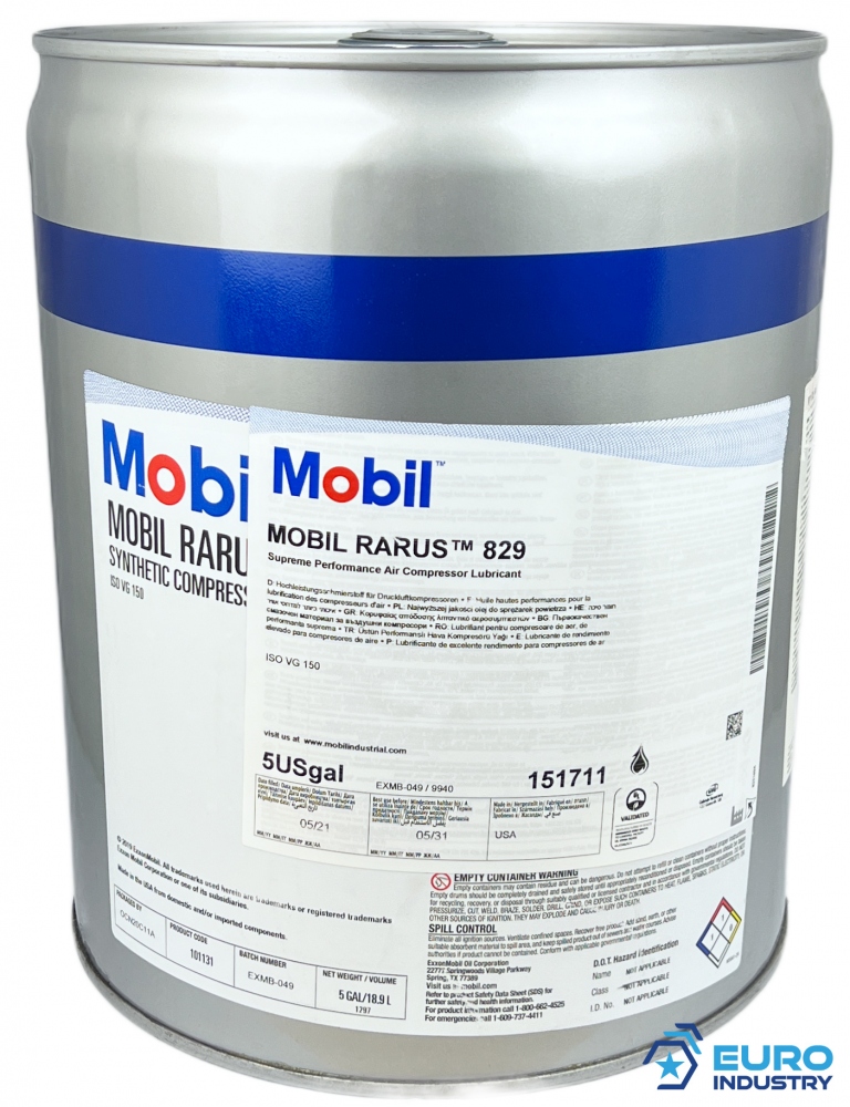 Mobil Rarus 829 Supreme performance air compressor lubricant – ISO VG 150 ( 151711, 101131 )Mobil Rarus 829 is primarily intended for the lubrication of severe duty reciprocating air compressors but not recommended for air compressors used in breathing air applications. It is engineered to meet or exceed the stringent requirements of the major compressor manufacturers. It is formulated with design-specific synthetic base-oils and a high technology additive system that assures exceptional equipment protection and reliability for compressors operating under conditions where mineral-oil based products are not meeting expectations. Rarus 829 provides excellent wear protection and outstanding resistance to oxidation and thermal degradation, greatly superior to mineral oils. Their unique formulation provides the ability to help reduce maintenance costs through minimising equipment problems and downstream deposits and carryover.Mobil Rarus 829 significantly reduce the potential for fires and explosions, compared to mineral oil-based products. It exhibits a virtual absence of deposit formation and higher autogenous ignition temperatures improving both performance and safety. It’s exceptional water separating characteristics reduce problems with emulsion formation and carryover into downstream piping and equipment. It is recommended or approved by many of the leading compressor manufacturers.The Mobil Rarus™ 800 series is also available in ISO VG 32 (Mobil Rarus 824) and 100 (Mobil Rarus 827)FeaturesHigh Performance Synthetic Base StocksLow Ash and Carbon FormationOutstanding Oxidation and Thermal StabilityHigh Load-carrying abilityExcellent Water SeparabilityEffective Rust and Corrosion ProtectionAdvantages and Potential BenefitsSignificant performance capabilities relative to mineral oilsImproved safetyImproved valve performanceReduced deposits in discharge linesReduced potential for fires and explosions in discharge systemsImproved compressor performanceLonger oil lifeImproved filter lifeLower maintenance costsReduced wear of rings, cylinders, bearings and gearsLess carryover to downstream equipmentReduced sludge formation in crankcases and discharge linesReduced blockage of coalescersLess potential for emulsion formationImproved protection of valves and reduced wear of rings and cylindersApplicationsAll types of air compressors but specifically recommended for reciprocating air compressorUnits operating under severe conditionsMultistage units with a history of excessive oil degradation from mineral oil-based productsFor cylinder and crankcase lubricationCompressor systems with critical gears and bearingsCompressors used in stationary and mobile applicationsNote: Not recommended for air compressors used in breathing air applicationsTechnical specificationsViscosity GradeISO 150Copper Strip Corrosion, 3 h, 121 C, Rating, ASTM D1301BFlash Point, Cleveland Open Cup, °C, ASTM D92270Foam, Sequence I, Stability, ml, ASTM D8920Foam, Sequence I, Tendency, ml, ASTM D89210Kinematic Viscosity @ 100 C, mm2/s, ASTM D44513.2Kinematic Viscosity @ 40 C, mm2/s, ASTM D445158Pour Point, °C, ASTM D5950-40Rust Characteristics, Procedure A, ASTM D665PASSTotal Acid Number, mgKOH/g, ASTM D974(mod)0.14Viscosity Index, ASTM D227070 Information on product safety (Manufacturer, Contact)EXXONMOBIL CENTRAL EUROPE HOLDING GMBH, Ericusspitze 2, 20457 Hamburg, GERMANY, +49 40 6393 0, , www.exxonmobil.de