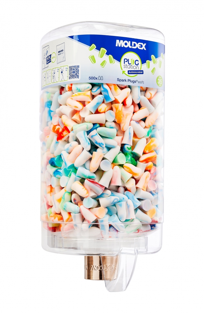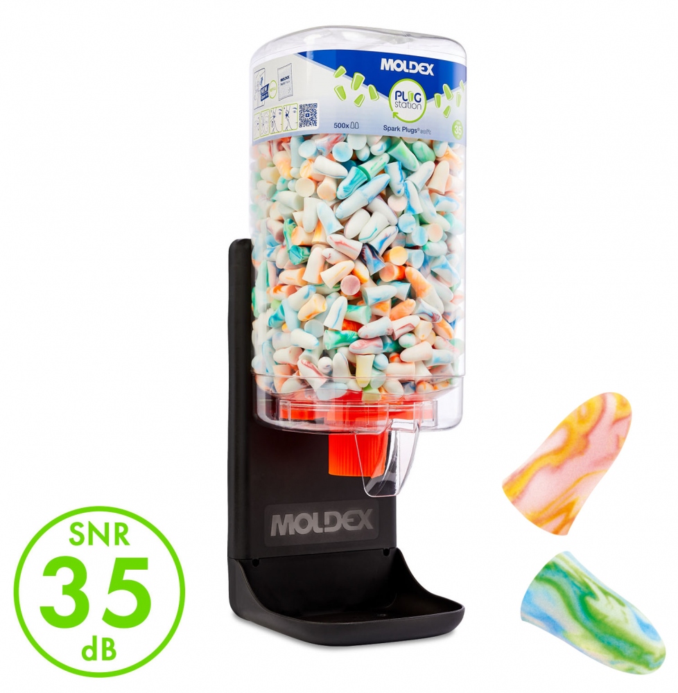 Moldex 7850 Spark plugs station with 500 pairs earplugs EN352-2.The ear plug station is a unique dispensing concept providing users with easy access to hearing protection from a sealed and hygienic source. The unit is disposable and completely recyclable providing for convenient servicing.Eliminates individual paper/poly bag packaging.Translucent `station` offers high visibility of the product therefore increasing the offer of your hearing protection programme.Spark Plugs Soft.SNR: 35 dBNote: Delivered without any wall mount ! Information on product safety (Manufacturer, Contact)Moldex/Metric AG & Co. KG, Tübinger Strasse 50, 72141 Walddorfhäslach, GERMANY, +49 7127 8101-02, , www.moldex-europe.com
