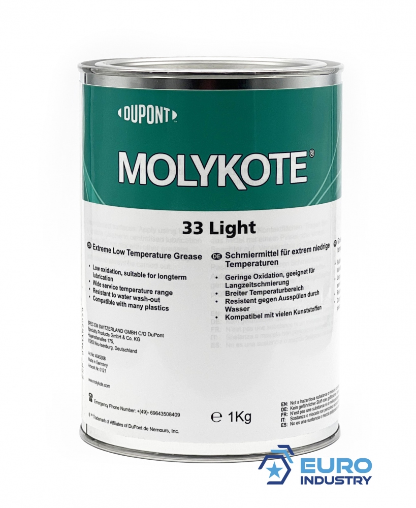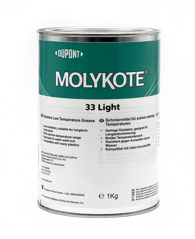 Lubricant for anti-friction bearings, plastic and rubber partsMolykote 33 Light (former Dow Corning DC 33 Light) is an extreme low temperature bearing grease (-73 °C). It is used to lubricate ball bearings operating under light to moderate loads.ApplicationsFreezer cart casters and cold room conveyor equipmentUtility disconnect switch contactsPlastic electric clock motorsMaximum-demand meters, power-factor meters, watt-hour metersWindshield wiper motor gearsPhotographic, optical and surveying equipmentOscillographs, geophysical and light, low-torque instrumentsStarter clutch drivesFeaturesHigh oxidation resistanceWide service temperature rangeGood low temperature performanceCompatible with many plasticsWater-resistantLight Very soft grease (NLGI grade 1)Technical SpecificationsComposition: Lithium soap, Phenylmethyl silicone oilTemperature range: -73°C to +180°CColor: whiteConsistency (NLGI grade): light (1)Size: 1kg Packaging type: can Also available as: , , , 180kg barrelFor detailed information Information on product safety (Manufacturer, Contact)DuPont de Nemours (Deutschland) GmbH, Hugenottenallee 175, 63263 NEU-ISENBURG, GERMANY, +49 (0) 6102 18 – 0, , www.dupont.de