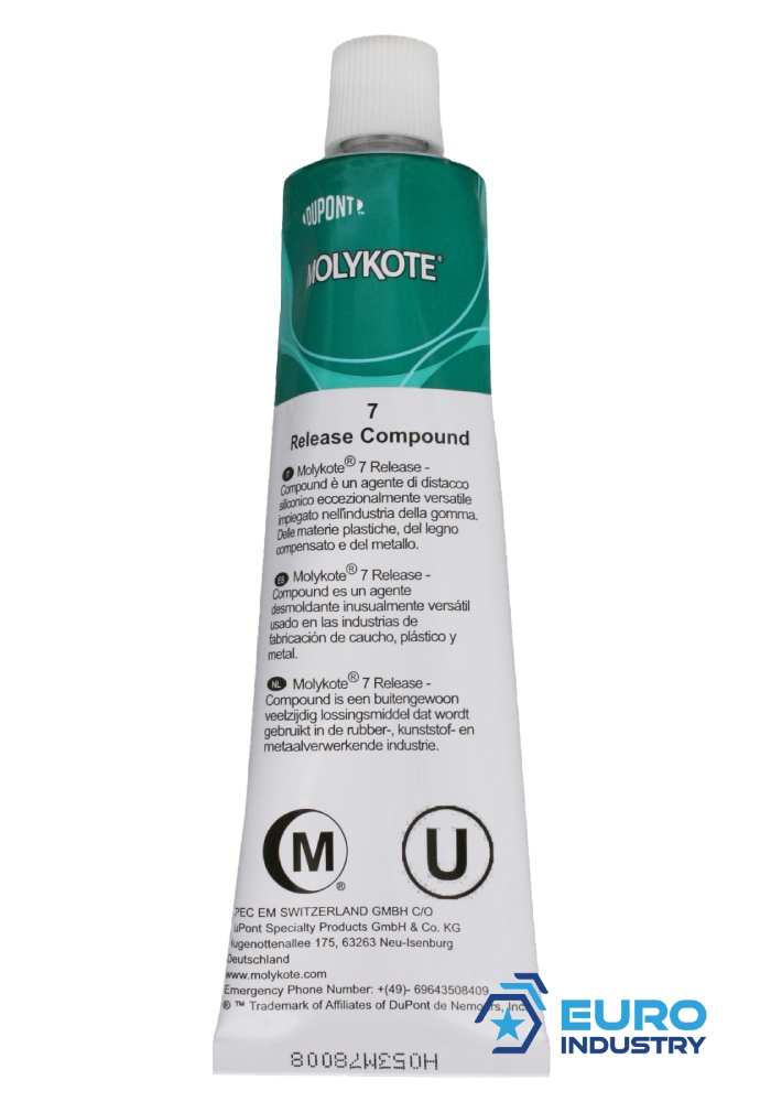 Molykote® 7 Release Compound (former Dow Corning DC 7 Compound) is a versatile, heat-stable, highly effective silicone release agent and lubricant for plastics, rubber, metals and adhesives. It gives long-lasting release, yet remains inert to most materials.ApplicationsMold release agent for foundry shell and core moldsBreak-in treatment for bladders on tire pressesRubber Lubricant and preservativeRelease agent for adhesives and gluesCable-pulling Lubricant to draw rubber-covered cable through conduitRelease agent for plastic extruders and processing equipmentRelease agent for plastic film packaging machinesControl cables, rubber & elastomer lubrication, valves, packings, seals & O-ringsFeaturesMaintain serviceable consistency from -40 to 204°C (-40 to 400°F)Practically nonvolatileMoisture-resistantElectrically insulatingExcellent rubber lubricationExcellent release and sealing propertiesResistant to oxidationShows little tendency to dry out in servicePermitted for food contact use under FDA Regulation 21 CFR 175.300Listed under NSF Standard 51 for use in food processing equipmentListed under NSF Standard 61 for use in potable water applicationsTechnical SpecificationsTechnology: Dimethyl SiliconeNLGI Grade: 1Thickener: SilicaLow Temp (C): -40High Temp (C): 204Color (PPSH-50): Translucent WhiteFilling quantity: 100gPackaging unit: tubeAlso available in: 300g cartridge, 5kg bucket, 25kg bucket, 200kg barrelFor detailed information view our