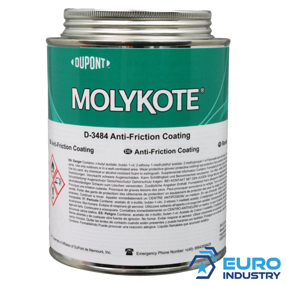 Molykote D3484 Anti-friction coating, heat-curing dry lubricant Temperature: From -70 to +250°CExcellent lubricating propertiesFast curing, hence particularly suitable for series production operationsHigh load-carrying capacityHigh abrasion resistanceLong service lifeVolume: 500g CanAlso available as: 5kg PailsApplicationsSliding contacts of metal/metal combinations with slow to moderate fast movements and moderate to high loadsUsed successfully for carburetor springs, lorry-coupling sleeves, toothed gears and parts of car safety belts and car-boot lock partsBolts and levers in tractors and construction machinesTechnical specificationsTemperature: From -70 to +250°CColor: Black / GreyFor detailed informations view our Hazard Information (CLP)Signal Word: DangerHazard Statements (H-Sentences)H226: Flammable liquid and vapour.H315: Causes skin irritation.H318: Causes serious eye damage.H336: May cause drowsiness or dizziness.Precautionary Statements (P-Sentences)P210: Keep away from heat, hot surfaces, sparks, open flames, and other ignition sources. No smoking.P261: Avoid breathing mist or vapours.P264: Wash skin thoroughly after handling.P280: Wear protective gloves, protective clothing, eye protection, and face protection.P305 + P351 + P338 + P310: IF IN EYES: Rinse cautiously with water for several minutes. Remove contact lenses if present and easy to do. Continue rinsing. Immediately call a POISON CENTER/doctor.P370 + P378: In case of fire: Use dry sand, powder or alcohol-resistant foam to extinguish.Additional Information (EUH Statements)EUH208: Contains: Formaldehyde. May cause allergic reactions.×Hazardous materials. The forwarding charges may be raised, if shipping to: DE, AT, NL, GB, CH, CZ, IT, ES, FI, NO, BE, IE, RO, PL, FR, PT, LU, DK, LI, GR, SE, SK, BG, SI, CA, LT, EE, LV, HR, SA, Information on product safety (Manufacturer, Contact)DuPont de Nemours (Deutschland) GmbH, Hugenottenallee 175, 63263 NEU-ISENBURG, GERMANY, +49 (0) 6102 18 – 0, , www.dupont.de