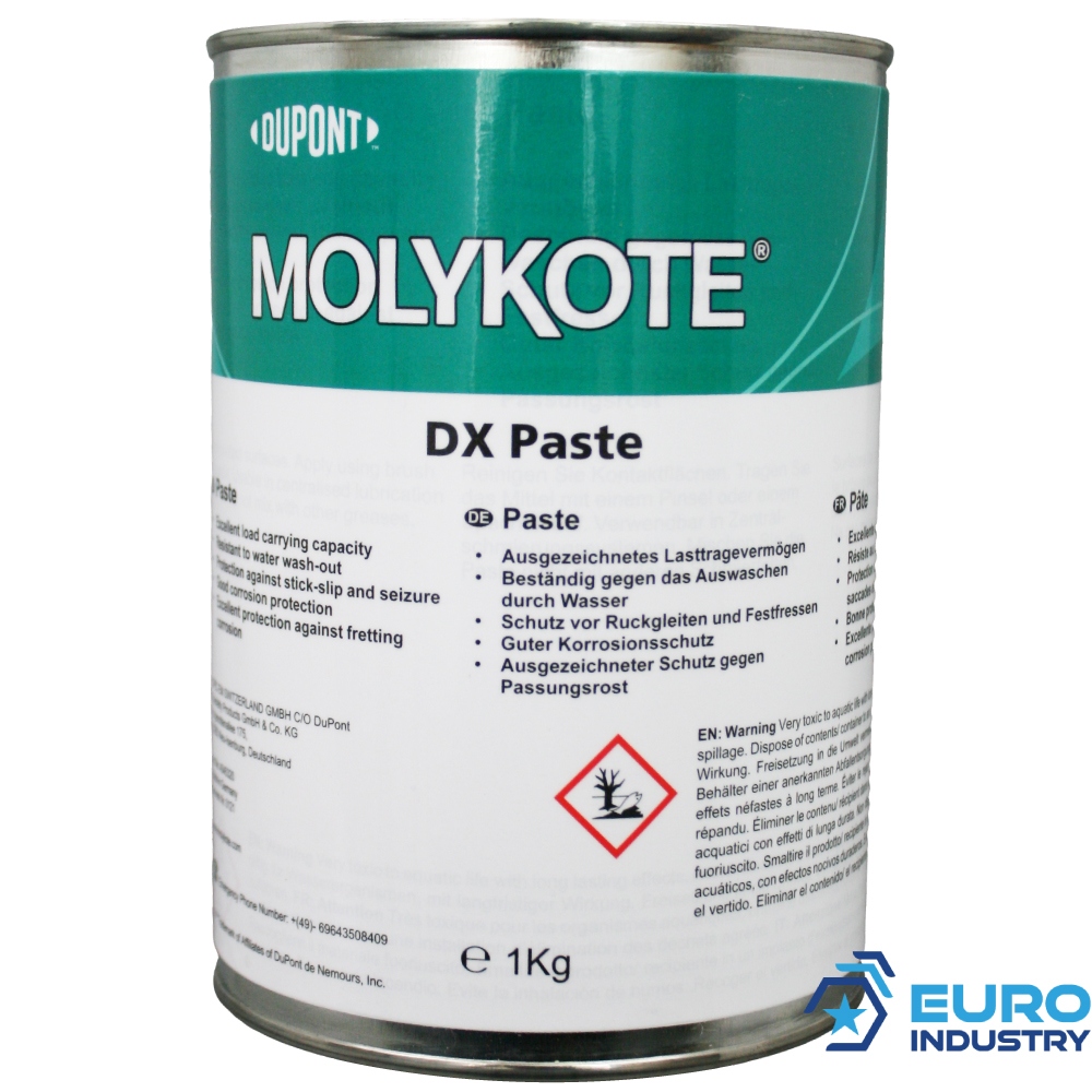 Molykote DX Paste is a light-colored grease-paste with solid lubricants for assembly and long-term lubrication of metallic components.ApplicationsSliding surfaces and frictional contacts exposed to heavy loads, requiring “clean” lubrication, especially at low to medium speedsMany frictional contacts of electrical and domestic appliances, packaging and office machinery, precision instruments, machinery in foodstuffs and beverages industry, as well as in textile and plastics processing machineryFeaturesHigh load-carrying capacityGood water and water wash-out resistancePrevents stick-slip and seizureGood corrosion protectionExcellent protection against gallingCleannessTechnical SpecificationComposition: mineral oil, lithium soap, solid lubricants, corrosion inhibitorTemperature range: -25°C to +125°CColor: whiteDensity at 20°C: 1.1 g/mlBase oil viscosity at 40°C: 110 mm²/sSize: 1 kgPackaging type: tinAlso available in: , , , 50kg drumFor detailed information view out Hazard Information (CLP)Signal word: Warning.Hazard Statements (H-phrases)H410: Very toxic to aquatic life with long lasting effects.Precautionary Statements (P-phrases)Prevention:P273: Avoid release to the environment.Response:P391: Collect spillage.Disposal:P501: Dispose of contents/container to a certified waste disposal facility. Information on product safety (Manufacturer, Contact)DuPont de Nemours (Deutschland) GmbH, Hugenottenallee 175, 63263 NEU-ISENBURG, GERMANY, +49 (0) 6102 18 – 0, , www.dupont.de