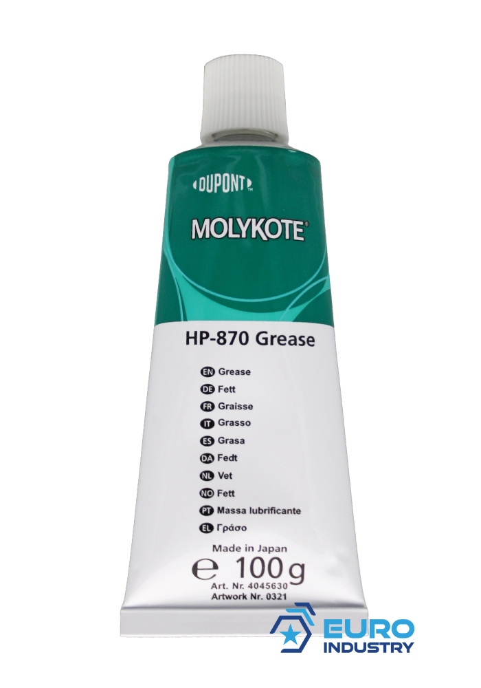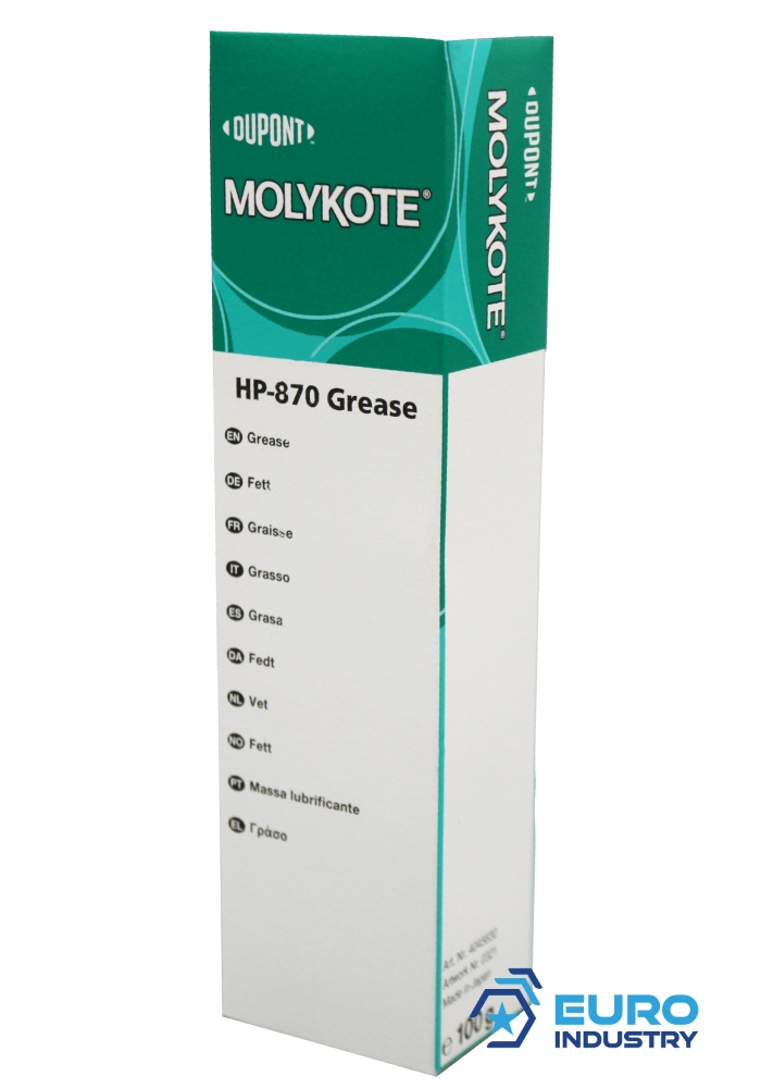 Molykote HP-870 Fully fluorinated lubricating grease for metal/metal and metal/plastic combinations Temperature Range: From -20 to +250°C, up to +280°C for short periodsLubricating grease for metal/metal and metal/plastic combinations with slow tomedium-fast movements and extremely high loadsSuitable for long-term lubricationHigh loading capacityCan be used over a widetemperature rangeHighly resistant to water Resistant to many chemicalsCompatible withmany plastics and elastomersVolume: 100g TubeAlso available as: 1kg Can; 10kg Pails; 25kg PailsApplicationUsed successfully for sliding and roller bearings in refrigerationplants, in pump and fan bearings, and also for charging equipment in the chemical andpetrochemical industryTechnical specificationsTemperature Range: From -20 to +250°C, up to +280°C for short periodsNLGI class: 2Thickener: PTFESolid lubricant content: PTFEBase oil viscosity at 40C – 350Color: WhiteFor detailed informations view our Information on product safety (Manufacturer, Contact)DuPont de Nemours (Deutschland) GmbH, Hugenottenallee 175, 63263 NEU-ISENBURG, GERMANY, +49 (0) 6102 18 – 0, , www.dupont.de