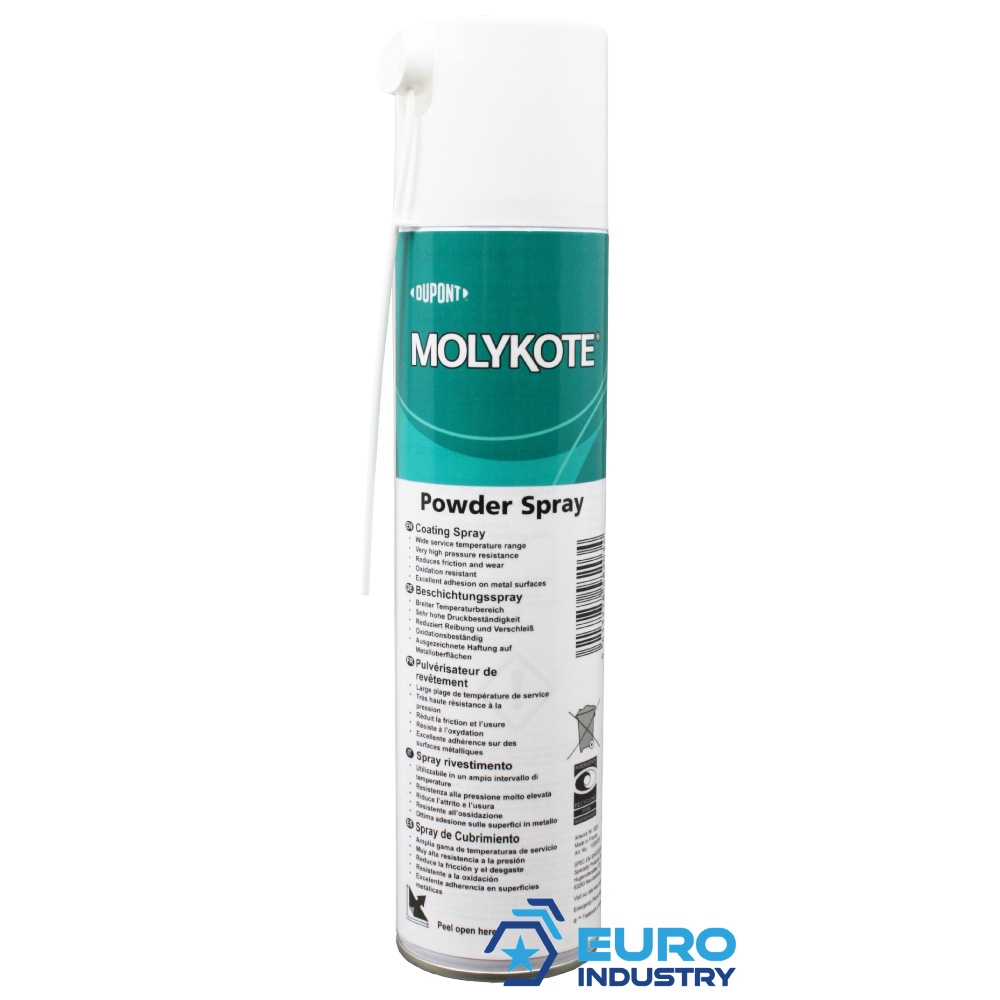 Molykote powder spray MoS2 for effective lubrication of all types of metal surfaces Service temperature range: From -185 to +450°CReduction of friction and wearExcellent adhesion on metal surfacesExtreme pressure resistanceResistant to oxidationWide service temperature rangeColor: blackContent: 400ml Spray canApplicationsCoating of metallic frictional contacts which cannot be sufficiently lubricated with oil or grease due to high loads, low speeds or unfavorable environmental influencesMetal/plastic pairings under low loads and low to medium speedsTechnical SpecificationsService temperature range: From -185 to +450°CComposition: Molybdenum disulphideColor: BlackFor detailed information, view our Hazard Information (CLP)Signal word: Danger.Hazard Statements (H-phrases)H222: Extremely flammable aerosol.H229: Pressurized container: may burst if heated.H336: May cause drowsiness or dizziness.H412: Harmful to aquatic life with long-lasting effects.Precautionary Statements (P-phrases)P210: Keep away from heat, hot surfaces, sparks, open flames, and other ignition sources. No smoking.P211: Do not spray on an open flame or other ignition source.P251: Do not pierce or burn, even after use.P261: Avoid breathing aerosol.P271: Use only outdoors or in a well-ventilated area.P410 + P412: Protect from sunlight. Do not expose to temperatures exceeding 50 °C/122 °F.Additional InformationContains Naphtha (petroleum), hydrotreated heavy; Naphtha, hydrotreated light.×Hazardous materials. The forwarding charges may be raised, if shipping to: DE, AT, NL, GB, CH, CZ, IT, ES, FI, NO, BE, IE, RO, PL, FR, PT, LU, DK, LI, GR, SE, SK, BG, SI, CA, LT, EE, LV, HR, SA, Information on product safety (Manufacturer, Contact)DuPont de Nemours (Deutschland) GmbH, Hugenottenallee 175, 63263 NEU-ISENBURG, GERMANY, +49 (0) 6102 18 – 0, , www.dupont.de