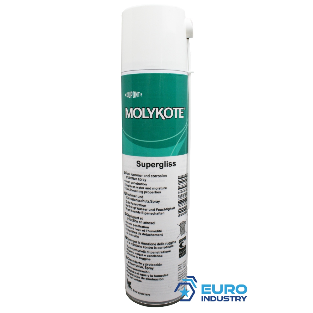 Molykote Supergliss lubricating coating spray with penetrating propertiesService temperature range: From -50 to +50°CPenetrationRust loosening propertiesLubricationCorrosion protectionColor: light transparentContent: 400ml Spray canApplicationsSimplify dismantling of rusty components. Used as corrosion protectionTechnical SpecificationsService temperature range: from -50°C to +50°CBase oil viscosity at 40°C: 3.59Color: light transparentFor detailed information, view our Hazard Statements (CLP)Signal word: Danger.Hazard Statements (H-phrases)H222: Extremely flammable aerosol.H229: Pressurized container: May burst if heated.Precautionary Statements (P-phrases)P210: Keep away from heat, hot surfaces, sparks, open flames and other ignition sources. No smoking.P211: Do not spray on an open flame or other ignition source.P251: Do not pierce or burn, even after use.P261: Avoid breathing aerosol.P271: Use only outdoors or in a well-ventilated area.P410 + P412: Protect from sunlight. Do not expose to temperatures exceeding 50 °C/122 °F.Additional Information (EUH phrases)EUH066: Repeated exposure may cause skin dryness or cracking.EUH208: Contains: Benzene sulfonic acid, Mono-C16-24-alkyl derivatives, calcium salts. May produce an allergic reaction. ×Hazardous materials. The forwarding charges may be raised, if shipping to: DE, AT, NL, GB, CH, CZ, IT, ES, FI, NO, BE, IE, RO, PL, FR, PT, LU, DK, LI, GR, SE, SK, BG, SI, CA, LT, EE, LV, HR, SA, Information on product safety (Manufacturer, Contact)DuPont de Nemours (Deutschland) GmbH, Hugenottenallee 175, 63263 NEU-ISENBURG, GERMANY, +49 (0) 6102 18 – 0, , www.dupont.de