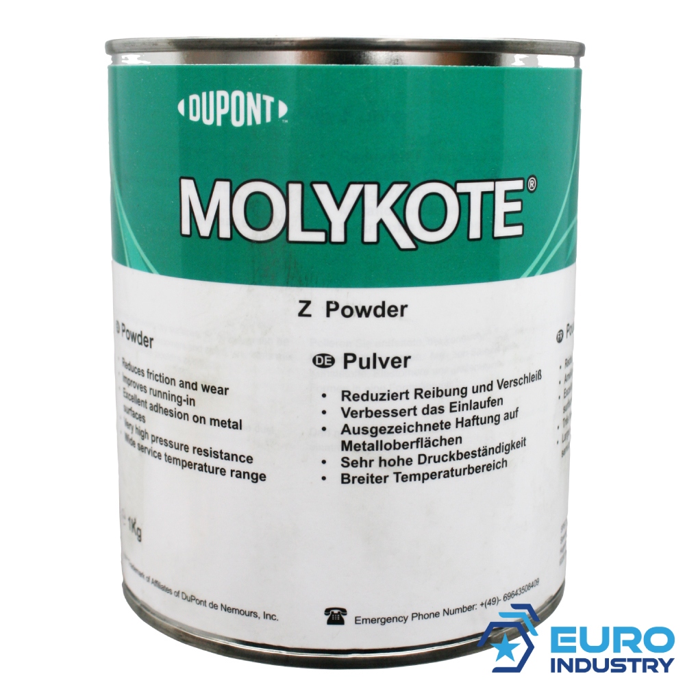 Molykote Z Powder Multi-purpose MOS2 powder used as a dry burnished lubricant or performance additive Temperature range: from 185°C to +400°CExcellent lubricating propertiesReduction of friction and wearOxidation resistantExtreme pressure resistanceWide service temperature rangeContents: 1kg canAlso available as: 25kg bucket; 100kg drumApplicationsDry burnished (reamed) lubricating film for metal contactsSolid lubricant additive for self-lubricating plastics and sintered metal partsSolid lubricant additive in metalworking compoundsSolid lubricant additive in brake lining applicationRunning-in aid in pressed joints, for heavy loads and slow speedsTechnical data Temperature: Temperature range: From 185°C to +400°CViscosity of the base oil at 40°C (mm²/s) : 4.80Colour: BlackDetailed information can be found in our Information on product safety (Manufacturer, Contact)DuPont de Nemours (Deutschland) GmbH, Hugenottenallee 175, 63263 NEU-ISENBURG, GERMANY, +49 (0) 6102 18 – 0, , www.dupont.de