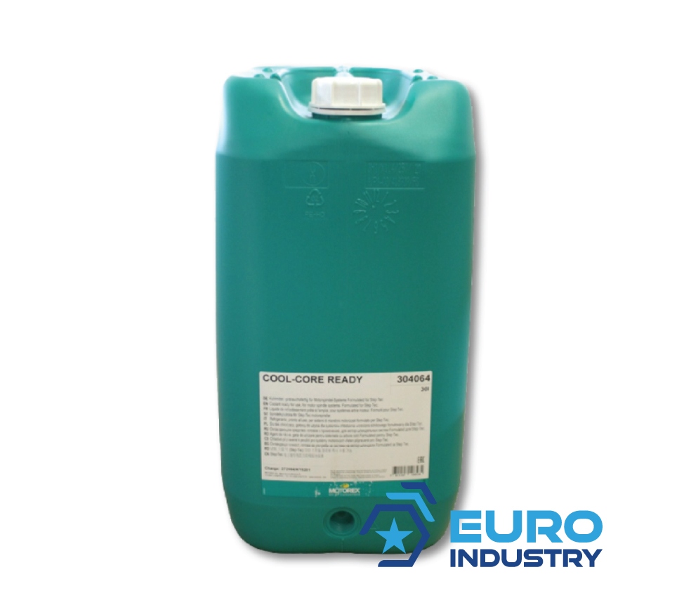 COOL-CORE READY is used as coolant and an anti-corrosion agent in motor spindle cooling systems, in particular where there is an inadequate supply of clean drinking water available for mixing purposes. The substances it contains passivate the various materials and provide long-term protection against corrosion. COOL-CORE READY is particularly useful for problem-free cooling of drive shafts where high-power fast-turning motor spindles are used. The coolant can naturally also be used in systems that operate under less heavy loads. Volume: 30 L canisterColor: light blueAdvantagesPrevents electrochemical corrosionProtects aluminum, nonferrous and ferrous metalsLow maintenanceLong term protectionFrost-proof down to -30 ° CContains no dangerous goods -> easy shipment worldwideMaintenanceCOOL-CORE READY must be checked periodically in accordance with the specifications of the spindle or machine manufacturer (please note the maintenance instructions on the back).If a third-party product is to be replaced with COOL-CORE READY, the cooling system must be treated with 3% for 48 operating hours before the change.Please note the maintenance instructions of the spindle manufacturer.ApplicationCOOL-CORE READY is ready to use, do not add water. An average operating temperature of 20 – 25 ° C is very effective in protecting elastomers in the long term.If the conditions of use are optimal and the instructions for use are observed, the coolant can remain in use for up to 4 years.Attention: Neither galvanized components in the cooling system nor such materials may be used for mixing vessels or storage tanks.StorageStore COOL-CORE READY in the original container at 5 – 35 ° C. The max.Storage time in the closed original container is 4 years.Synergy Project “Use synergies and incorporate them into the products for the benefit of the user”, that is the motto of the MOTOREX Synergy Project.Products that incorporate knowledge from the synergies that have arisen between machine and tool manufacturers, users and MOTOREX are referred to at MOTOREX as the so-called Synergy Project.Technical specificationsPropertiesTest byValuesColor Light blueDichte bei 20 °CASTM D40521.034 g/mlViscosity at 40°CDIN 515621.56 mm2/sFactor refractometer 1.3 % BrixpH value 7.5 – 8.5Operating temperature 4 – 80 °CSolidification pointASTM D 5950-30 °CApplication concentration 30 – 36 % Information on product safety (Manufacturer, Contact)MOTOREX AG, Bern-Zürich-Strasse 31, 4901 Langenthal, SWITZERLAND, +41 62 919 75 75, , www.motorex.com