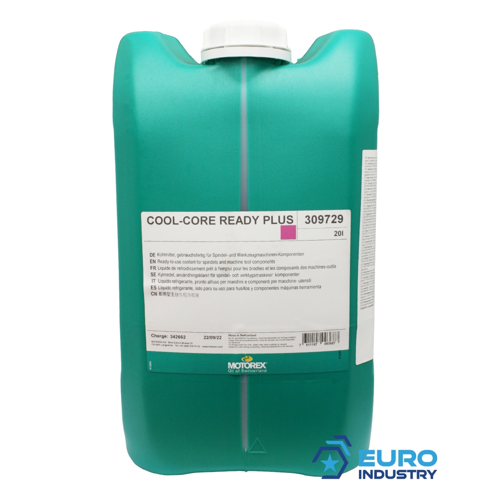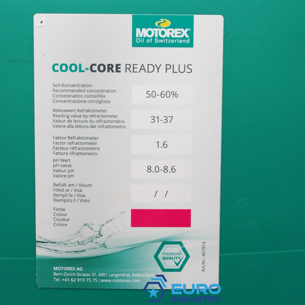 COOL-CORE READY PLUS is used as coolant and an anti-corrosion agent in motor spindle cooling systems, in particular where there is an inadequate supply of clean drinking water available for mixing purposes. The substances it contains passivate the various materials and provide long-term protection against corrosion. COOL-CORE READY PLUS is particularly useful for problem-free cooling of drive shafts where high-power fast-turning motor spindles are used. The coolant can naturally also be used in systems that operate under less heavy loads. Volume: 20 L canisterColor: pinkAdvantagesPrevents electrochemical corrosionProtects aluminum, nonferrous and ferrous metalsLow maintenanceLong term protectionFrost-proof down to -30 ° CContains no dangerous goods -> easy shipment worldwideMaintenanceCOOL-CORE READY PLUS must be checked periodically in accordance with the specifications of the spindle or machine manufacturer (please note the maintenance instructions on the back).If a third-party product is to be replaced with COOL-CORE READY PLUS , the cooling system must be treated with 3% for 48 operating hours before the change.Please note the maintenance instructions of the spindle manufacturer.ApplicationCOOL-CORE READY PLUS is ready to use, do not add water. An average operating temperature of 20 – 25 ° C is very effective in protecting elastomers in the long term.If the conditions of use are optimal and the instructions for use are observed, the coolant can remain in use for up to 4 years.Attention: Neither galvanized components in the cooling system nor such materials may be used for mixing vessels or storage tanks.StorageStore COOL-CORE READY PLUS in the original container at 5 – 35 ° C. The max.Storage time in the closed original container is 4 years.Synergy Project “Use synergies and incorporate them into the products for the benefit of the user”, that is the motto of the MOTOREX Synergy Project.Products that incorporate knowledge from the synergies that have arisen between machine and tool manufacturers, users and MOTOREX are referred to at MOTOREX as the so-called Synergy Project.Technical specificationsPropertiesTest byValuesManufacturer No. 309729 ( old number 305602 )Color PinkDichte bei 20 °CASTM D40521.070 g/mlViscosity at 40°CDIN 515621.2 mm2/sFactor refractometer 1.6 % BrixpH value 8.0 – 8.6Operating temperature 4 – 80 °CSolidification pointASTM D 5950-30 °CApplication concentration 50 – 60 % Hazard Information (CLP)Signal word: WarningHazard Statements (H-Statements)H302: Harmful if swallowed.H373: May cause damage to organs through prolonged or repeated exposure.Precautionary Statements (P-Statements)Prevention:P101: If medical advice is needed, have product container or label at hand.P102: Keep out of reach of children.P103: Read instructions carefully and follow them.P260: Do not breathe dust/fume/gas/mist/vapors/spray.P264: Wash thoroughly after handling.P270: Do not eat, drink or smoke when using this product.Response:P301+P312: IF SWALLOWED: Call a POISON CENTER/doctor if you feel unwell.P330: Rinse mouth.P314: Get medical advice/attention if you feel unwell.Disposal:P501: Dispose of contents/container in accordance with local/regional/national/international regulations.EAN Old 25L container : 7611197123545 Information on product safety (Manufacturer, Contact)MOTOREX AG, Bern-Zürich-Strasse 31, 4901 Langenthal, SWITZERLAND, +41 62 919 75 75, , www.motorex.com
