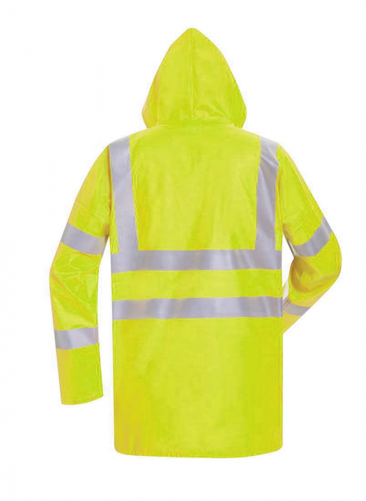 Norm: EN ISO 20471, class 3, EN 343 class 3/1, EN 1149-5, EN ISO 14116, index 1, EN ISO 13688Shell fabric: PU coated polyester, ca. 190 g/m²Water column: 8.000mmColour: fluorescent yellowSizes: S-XXXLSpecifications:Breathable, wind and water proofExtremely lightweight, flexible materialDouble welded seamsWelded reflective stripesFlame retardant according to EN ISO 14116Antistatic according to EN 1149-5Four-way stretchableCovered front zipper with additional press buttonsHood with draw cordsSleeve hem with press buttonsMultinorm sign on the left upper sleevePockets2 pockets with flaps