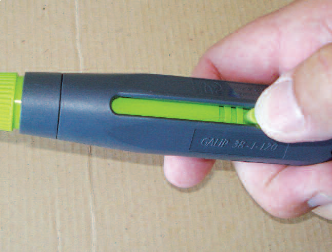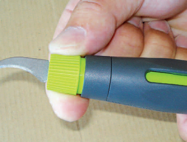 GALIP REF. 38.1.120 – Robust knife for removing encapsulation residues.Polyamide and aluminum handleIDEAL for cutting thick plasticsSECURE KNIFE: Blade protection system.ERGONOMIC / LIGHT / VERY ROBUST / SIMPLE USEFUNCTIONAllows deburring, trimming, descaring and cutting of soft plastic safely.PRINCIPLE OF OPERATIONAfter having inserted the protector of the blade until its total insertion in the handle, deburring, detour, décarotter and cut the flexible plastic.USERSAnyone whose activity includes performing deburring, trimming, descaring or cutting work.CHARACTERISTICSDeburring safety knife delivered with a 120.6 upper steel blade.Blade protected to the maximum during use and fully protected at rest.Possibility of adapting several blades: 120.6, 127.8, 127A.8.Easy blade change.Ambidextrous.STRENGTHSHigh cutting accuracyLightweight. Ergonomic. Sign language comfort.Easy to use for right and left handed people.Resistant to acetone.PAH CONTENT IS LESS THAN THE REQUIREMENTS OF THE STANDARDBLADE CHANGE1. / Turn the knob counterclockwise (-OFF) until the blade can be released.2. Press and turn the green knob and slide the blade through the slot provided (at the end of the knife).3. / Place a new blade then turn the knob 1/4 turn clockwise (- ON) until it is locked, without forcing. Information on product safety (Manufacturer, Contact)SAS MURE ET PEYROT, 25 Rue Roger Touton BP 50120, 33041 Bordeaux Cedex, FRANCE, +33 5 56 69 32 00, , www.mure-peyrot.com