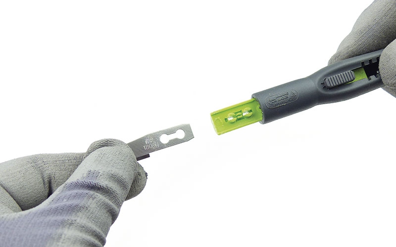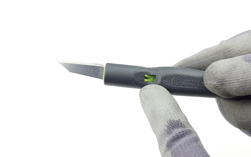 MULTIFUNCTIONAL SAFETY KNIFE – Ideal for deburring, trimming and de-coring flexible plastics. Also allows cutting of single corrugated cardboard boxes, wrapping adhesives and string.SAFETY – The blade is self-locked in the working position.PRACTICAL – Several blade formats possible.EFFECTIVE PROTECTION – By pressing down on the tip of the blade, it remains blockedErgonomic handle – great gestural comfortAnti-slip and self-locking sliderPossibility to hang it at ZicouBlade change from the frontCursor position notches for blade adjustmentLightweight and robustHigh cutting precisionCompactPossibility to adjust the cutting depth and the output of the blade.Resistant to detergents and acetone.Delivered with a sharp tip blade ref Several sizes of the blade possible: 180A.6, , 120A.6Technical specificationsMaterial : PA 6 Polyamid + 30% FVType of packaging : boxUnit weight: 26 gDimensions (in mm) : 138 x 21 x 18Number per packaging : 10 copy