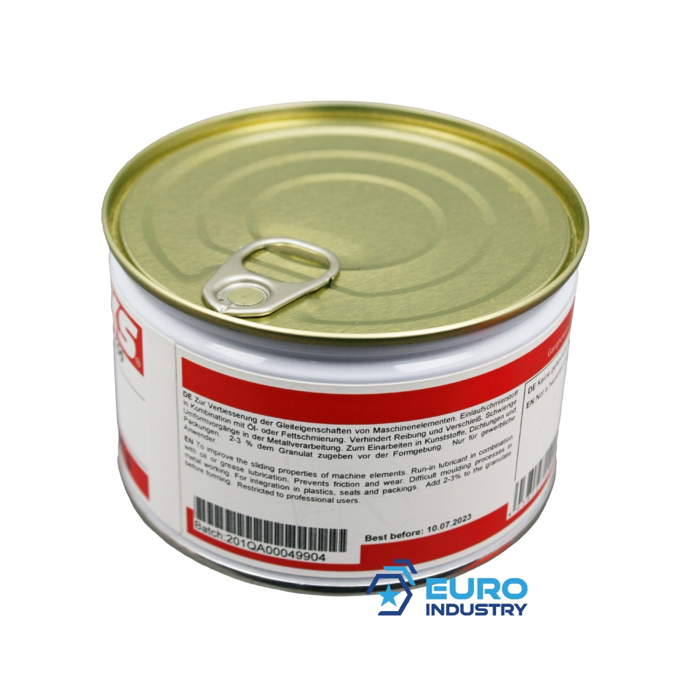 MoS₂-powder to improve the sliding properties of machine elementsField of applicationFor sliding properties improvement of machine parts, apparates and precision machinery, e.g. under the influence of oxygen, in vacuum or radioactive radiationDry lubrication for tools or workpieces in cold- and thermoformingFor incorporation in plastics, sealings, packages, sintered metals and improvement of sliding propertiesFor long-term or possibly lifetime-lubricationPropertiesReduces friction and wear in a wide temperature rangeHigh effectiveness due to high affinity of MoS₂ to metalsLow friction at highest load capacitiesLow consumption based on forming of extreme thin sliding filmsNot electrically conducting and not magneticChemically stable except against halogenated gases, concentrated sulfuric- and nitric acidTechnical DataSolid lubricants: MoS₂Share of solid lubricants, percent in weight: > 98.5Operating temperature -185°C until +450°C (up to +1,100°C in vacuum, up to +1,300°C in inert gas)Press-fit µ = 0.04, no chatterParticle size 16.0 – 30.0 µm, max. 190 µmDensity (at 20°C) g/cm³: approx. 4.8Colour: grey-blackSize: 250gPackaging type: tinAlso available in: , , IndustriesRail vehicle technologyMunicipal servicesIron and steel industryRubber and plastic processingLogisticsPaper and packaging industryChemical industryShipbuilding and marine technologyPlant and machine (tool) engineeringGlass and foundry industry