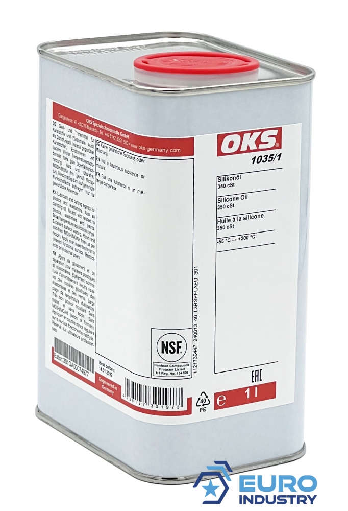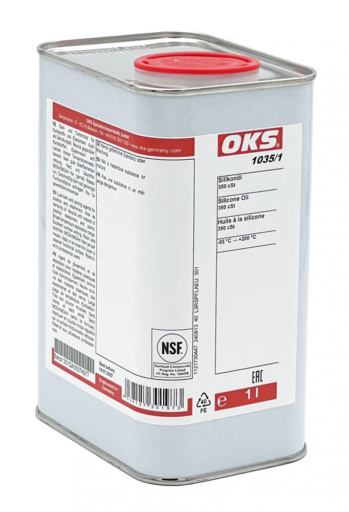 Silicone oil with 350 cSt, highly suited as lubricant and parting agent for plastics and elastomersField of applicationParting agent at foundry operations injection moulding, blowing and extruding processes of plastics and elastomerSliding agent against noisy rubbing of plastics, elastomers and metals together or against each otherLubrication of cutting edges in the paper, cardboard, veneer layer and textile processing machinesFor easy retracting of plastic and rubber profiles, e.g. in the door and window productionPropertiesHigh efficiency because of excellent netting of the surface and building of extremely thin lubricating filmsSeparating effect with antistatic propertiesManifold applications for permanent lubrication, protection, maintaining and impregnationNeutral behaviour against plastic and elastomersResistant against water and atmospheric influencesAvoids the sticking of e.g. adhesives and sealing excess or water wettingCan be supplied in viscosities of 50 to 5000 cStTechnical DataOperating temperature -50°C until +200° CDensity (20°C) 0.96 – 0.97 g/mlViscosity (25°C) 350 mm²/sContent 1lCanIndustriesCatering equipment and food processing technologyRail vehicle technologyMunicipal servicesIron and steel industryRubber and plastic processingLogisticsPaper and packaging industryChemical industryShipbuilding and marine technologyPlant and machine (tool) engineeringGlass and foundry industry Information on product safety (Manufacturer, Contact)OKS Spezialschmierstoffe GmbH, Ganghoferstr. 47, D-82216 Maisach-Gernlinden, +49 8142 3051 500, , www.oks-germany.com