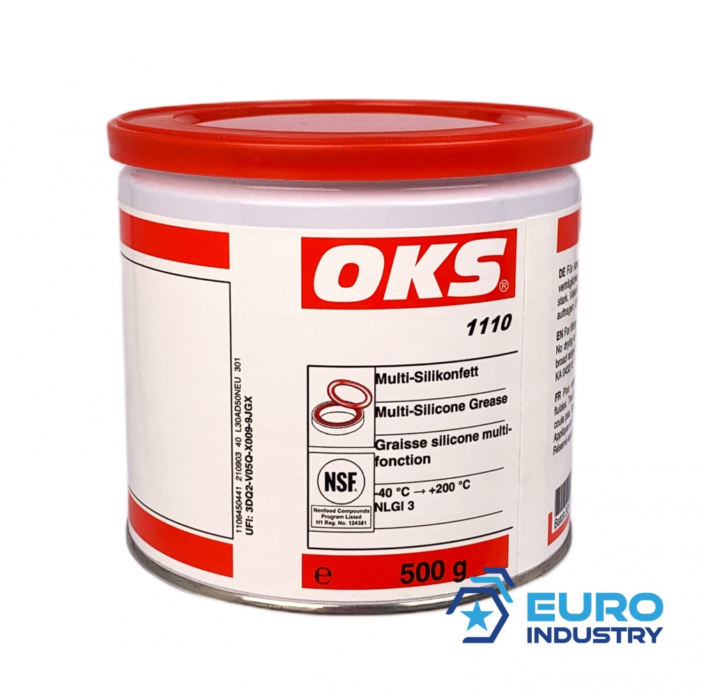 OKS 1110 is a highly adhesive transparent multi-usage silicone grease for fittings, seals and plastic parts. Suitable for the food processing industry.Field of applicationSealant and lubricant for cold and hot-water valves in vehicle heating systems or cooling circuits and for ground seals on glass taps and desiccatorsLubrication of O-rings and rubber seals for assembly and during operationLubrication of plastic partsPropertiesNSF H1 registeredTasteless and odourlessHighly effective due to excellent adhesion on all materialsNeutral behaviour with regard to plastics and elastomersCompletely EPDM-compatibleHigh long-term stability without drying out, hardening or bleedingResistant to cold and hot water, as well as acetone, ethanol, ethylene glycol, glycerine and methanolMOSH/MOAH-freeTechnical DataBase oil: silicone oilThickener: inorganicLower operating temperature: -40 °CUpper operating temperature: 200 °CConsistency grade (NLGI): 3Viscosity at (40°C): 9,500 mm²/s (base oil)Density (20°C) 1 g/cm³ Size: 500gPackaging type: tinAlso available in: , , , , , , and IndustriesCatering equipment and food processing technologyShipbuilding and marine technologyLogisticsChemical industryPaper and packaging industryIron and steel industryRail vehicle technologyGlass and foundry industryMunicipal servicesPlant and machine (tool) engineeringRubber and plastic processing