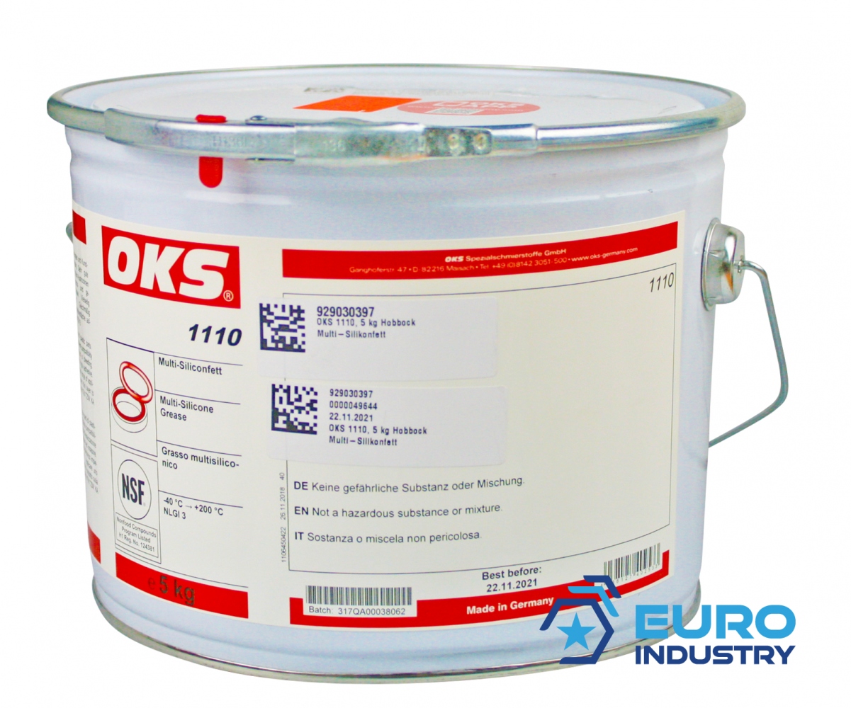 OKS 1110 is a highly adhesive transparent multi-usage silicone grease for fittings, seals and plastic parts. Suitable for the food processing industry.Field of applicationSealant and lubricant for cold and hot-water valves in vehicle heating systems or cooling circuits and for ground seals on glass taps and desiccatorsLubrication of O-rings and rubber seals for assembly and during operationLubrication of plastic partsPropertiesNSF H1 registeredTasteless and odourlessHighly effective due to excellent adhesion on all materialsNeutral behaviour with regard to plastics and elastomersCompletely EPDM-compatibleHigh long-term stability without drying out, hardening or bleedingResistant to cold and hot water, as well as acetone, ethanol, ethylene glycol, glycerine and methanolMOSH/MOAH-freeTechnical DataBase oil: silicone oilThickener: inorganicLower operating temperature: -40 °CUpper operating temperature: 200 °CConsistency grade (NLGI): 3Viscosity at (40°C): 9,500 mm²/s (base oil)Density (20°C) 1 g/cm³ Size: 5kg Packaging type: hobbockAlso available in: , , , , , , and IndustriesCatering equipment and food processing technologyShipbuilding and marine technologyLogisticsChemical industryPaper and packaging industryIron and steel industryRail vehicle technologyGlass and foundry industryMunicipal servicesPlant and machine (tool) engineeringRubber and plastic processing