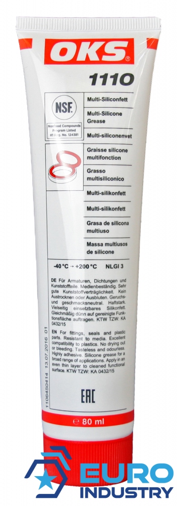OKS 1110 is a highly adhesive transparent multi-usage silicone grease for fittings, seals and plastic parts. Suitable for the food processing industry.Field of applicationSealant and lubricant for cold and hot-water valves in vehicle heating systems or cooling circuits and for ground seals on glass taps and desiccatorsLubrication of O-rings and rubber seals for assembly and during operationLubrication of plastic partsPropertiesNSF H1 registeredTasteless and odourlessHighly effective due to excellent adhesion on all materialsNeutral behaviour with regard to plastics and elastomersCompletely EPDM-compatibleHigh long-term stability without drying out, hardening or bleedingResistant to cold and hot water, as well as acetone, ethanol, ethylene glycol, glycerine and methanolMOSH/MOAH-freeTechnical DataBase oil: silicone oilThickener: inorganicLower operating temperature: -40 °CUpper operating temperature: 200 °CConsistency grade (NLGI): 3Viscosity at (40°C): 9,500 mm²/s (base oil)Density (20°C) 1 g/cm³ Size: 80mlPackaging type: tubeAlso available in: , , , , , , and IndustriesCatering equipment and food processing technologyShipbuilding and marine technologyLogisticsChemical industryPaper and packaging industryIron and steel industryRail vehicle technologyGlass and foundry industryMunicipal servicesPlant and machine (tool) engineeringRubber and plastic processing