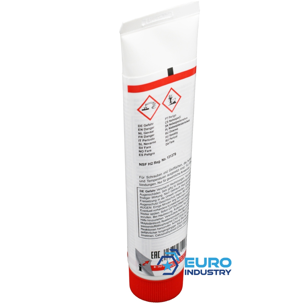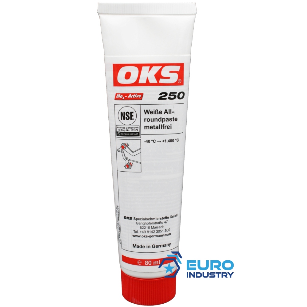OKS 250 is a high-temperature paste on ceramic basis for lubricating heavily loaded sliding surfaces.Field of applicationHigh-temperature paste for screws and sliding surfaces that are exposed to high pressures and temperaturesPropertiesOptimum balance of screw tightening torque to achievable pretensioningMetal freeExcellent corrosion protectionIdeal for stainless steel connectionsTechnical specificationsOperating temperature -40°C until +200°C (lubrication) +1,400°C (separation)Press-fit µ = 0.10, no chatterFour-ball test rig (welding load) 3,600 NThread friction (M10/8,8) µ = 0.12Content 80mlTubeApprovals NSF H2 (Reg 131379)IndustriesMaintenance and servicingMunicipal servicesChemical industryPlant and machine (tool) engineeringIron and steel industryGlass and foundry industryRubber and plastic processingShipbuilding and marine technologyPaper and packaging industryCatering equipment and food processing technologyLogisticsRail vehicle technology