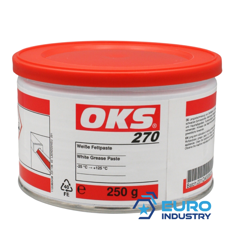 OKS 270 is a grease paste for long-term lubrication of sliding surfaces subjected to high pressureField of applicationLubrication of dirt-sensitive sliding points in mechanismsAssembly lubrication with large lubricant reservoir, e.g. chucks in which a supplemental relubrication at longer intervals with grease guns is possibleExcellently suited for dirt-free assembly and long-term lubricationPropertiesHighly effective due to optimum solid lubricant combinationLow consumption due to formation of highly effective lubricating filmsGood corrosion protection behaviourTechnical DataOperating temperature -25°C to +125° CPress-fit µ = 0.14, no chatterFour-ball test rig (welding load) 5,000 NThread friction (M10/8,8) µ = 0.09Content 250gTinIndustriesRail vehicle technologyMunicipal servicesIron and steel industryRubber and plastic processingLogisticsPaper and packaging industryChemical industryShipbuilding and marine technologyPlant and machine (tool) engineeringGlass and foundry industry