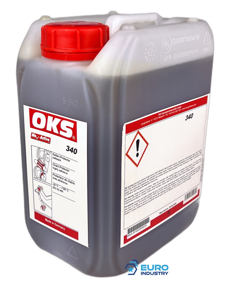 OKS 340 is a synthetic lubricant for indoor and outdoor machine elements subjected to high pressure or corrosive influencesField of applicationLubrication of fast-running drive chains of all designs for open or semi-open operation without a permanent re-lubricating device, such as motorcycle and bicycle chainsLubrication of hoisting chains such as multirow roller chains or stacker truck chains, as well as single or multiple flat-link articulated chainsPropertiesHighly effective due to outstanding creep and gap penetration propertiesExtreme adhesive strengthExtreme wear protection through Moₓ-Active additiveVery high resistance to cold and hot water as well as to saline solutionsExcellent corrosion protectionO-ring neutralTechnical DataBase oil: polyisobutyleneAdditives: Moₓ-ActiveAdditives: adhesion improverLower operating temperature: -30°CUpper operating temperature with solvent: 180°CDensity (20°C) 0.90 g/mlViscosity (40°C) 440 mm²/sViscosity classISo VG: 460Four-ball test rig (welding load) 2,600 NSize: 5lPackaging type: canisterAlso available in: , , 200l barrel and (OKS 341)IndustriesLogisticsChemical industryMunicipal servicesShipbuilding and marine technologyPaper and packaging industryRubber and plastic processingPlant and machine (tool) engineeringRail vehicle technologyGlass and foundry industryIron and steel industryHazard Information (CLP)Signal word: WarningHazard Statements (H-phrases)H319 Causes serious eye irritation.Precautionary Statements (P-phrases)Prevention:P264 Wash hands thoroughly after handling.P280 Wear eye/face protection.Response:P305 + P351 + P338 IF IN EYES: Rinse cautiously with water for several minutes. Remove contact lenses if present and easy to do. Continue rinsing.P337 + P313 If eye irritation persists: Get medical advice/attention.Additional Information (EUH-phrases)EUH208 Contains sulfonic acids, petroleum, calcium salts; molybdenum trioxide, reaction products with Bis [O,O-bis(2-ethylhexyl)] hydrogen dithiophosphate. May cause an allergic reaction. Information on product safety (Manufacturer, Contact)OKS Spezialschmierstoffe GmbH, Ganghoferstr. 47, D-82216 Maisach-Gernlinden, +49 8142 3051 500, , www.oks-germany.com