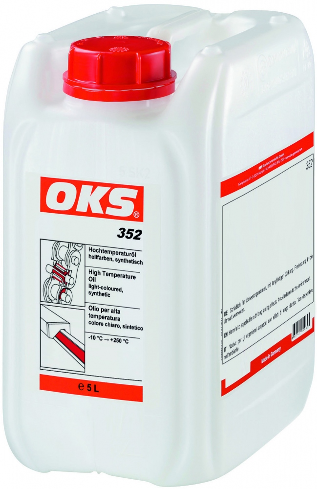 OKS 352 is a fully synthetic high-temperature oil with optimum wear protection also under influence of humidity. Operating temperature up to 250°C.Field of applicationLubrication of chains, hinges, joints, clamping and drying frames or slideways at higher temperaturesSuitable for conveying systems in painting, stoving, drying and cooling bed installationsPropertiesHighly effective due to optimum wear protection and outstanding oxidation propertiesResistant to water and steamGood creep propertiesVery good adhesion and lubrication effect with no tendency to dripTechnical DataBase oil: esterColour: yellowishViscosity at (40°C): 270mm²/sFlashing point > 79: > 250°C Lower operating temperature: -10°CUpper operating temperature with solvent: 250°CDensity (at 20°C): 0.9 g/cm³Size: 5lPackaging type: canisterAlso available in: l, , 200l barrel and (OKS 3521)IndustriesRubber and plastic processingIron and steel industryLogisticsGlass and foundry industryPlant and machine (tool) engineeringRail vehicle technologyMunicipal servicesPaper and packaging industryChemical industryShipbuilding and marine technology Information on product safety (Manufacturer, Contact)OKS Spezialschmierstoffe GmbH, Ganghoferstr. 47, D-82216 Maisach-Gernlinden, +49 8142 3051 500, , www.oks-germany.com