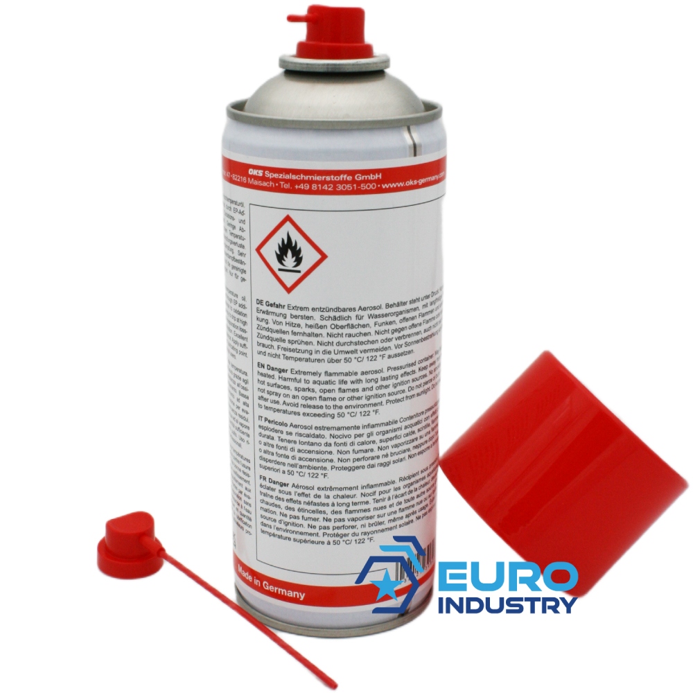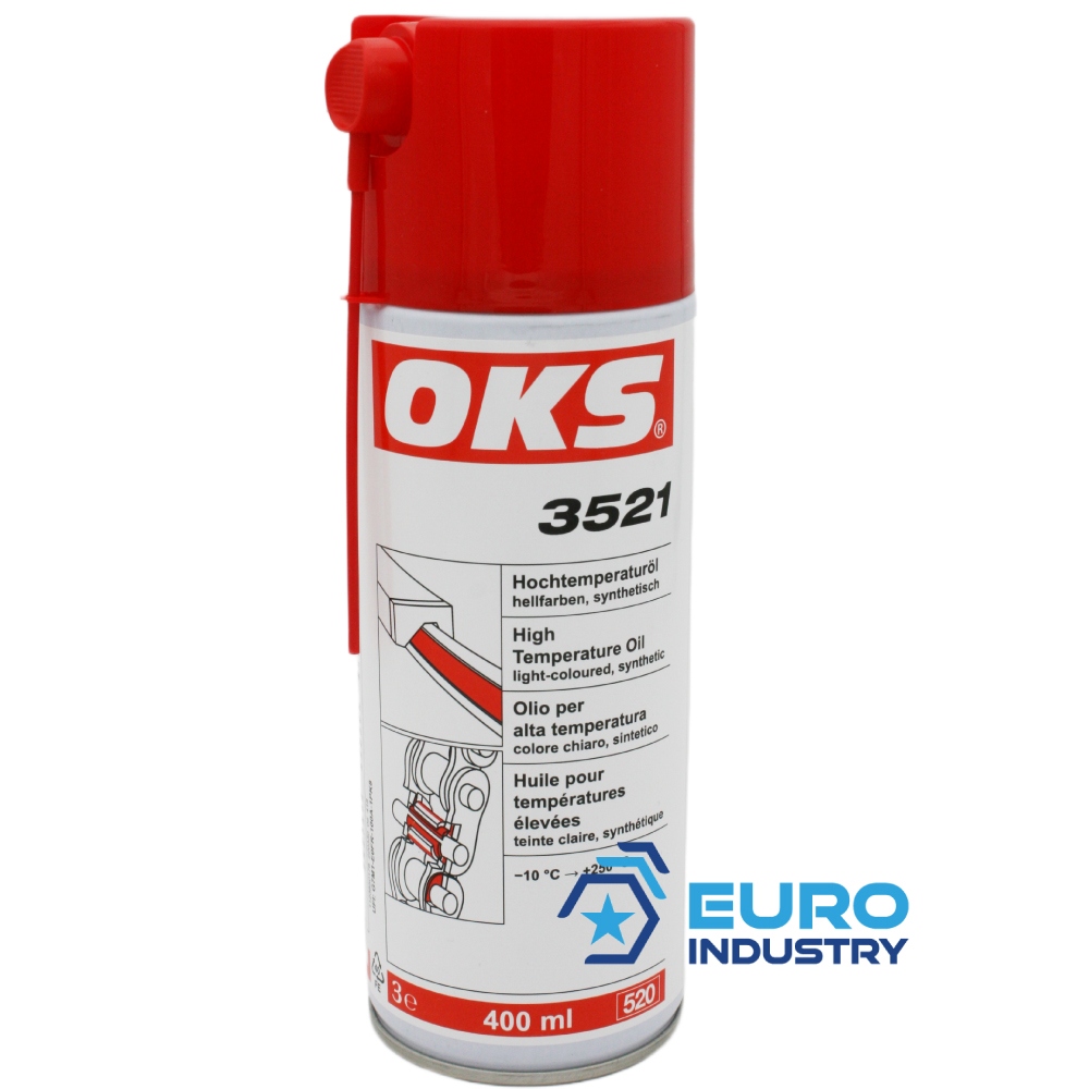 OKS 3521 spray is a fully synthetic high-temperature oil with optimum wear protection also under influence of humidity. Operating temperature up to 250°C.Field of applicationLubrication of chains, hinges, joints, clamping and drying frames or slideways at higher temperaturesSuitable for conveying systems in painting, stoving, drying and cooling bed installationsPropertiesHighly effective due to optimum wear protection and outstanding oxidation propertiesResistant to water and steamGood creep propertiesVery good adhesion and lubrication effect with no tendency to drip Technical DataBase oil: esterColour: yellowishViscosity at (40°C): 270mm²/sFlashing point > 79: > 250°C Lower operating temperature: -10°CUpper operating temperature : 250°CDensity (at 20°C): 0.9g/cm³Size: 400mlPackaging type: spray canAlso available in: , , , 200l barrel (OKS 352)IndustriesRubber and plastic processingChemical industryPlant and machine (tool) engineeringLogisticsMunicipal servicesPaper and packaging industryIron and steel industryGlass and foundry industryShipbuilding and marine technologyRail vehicle technology