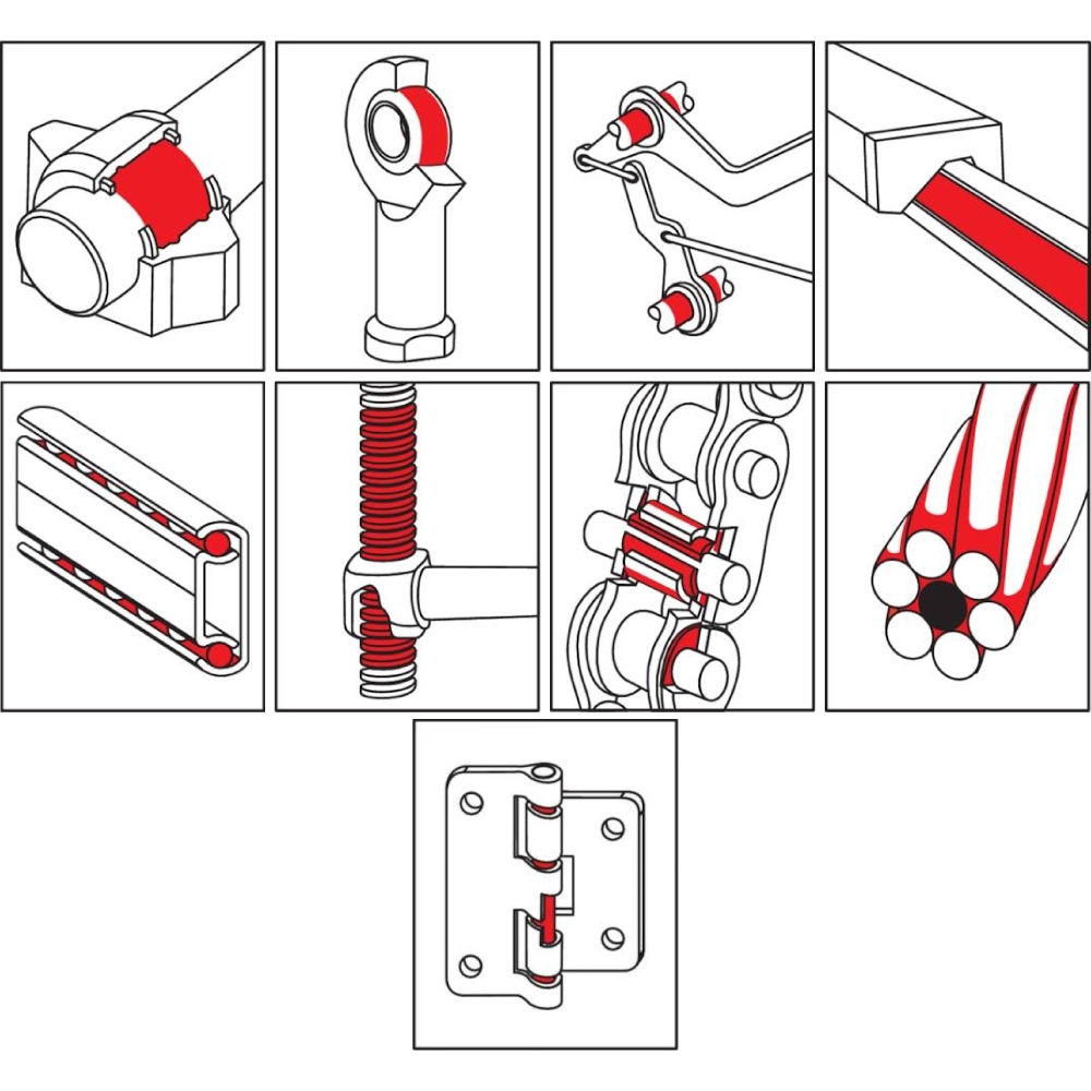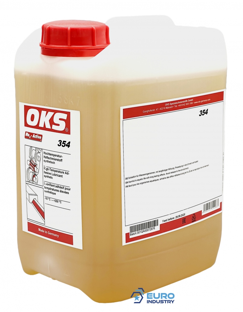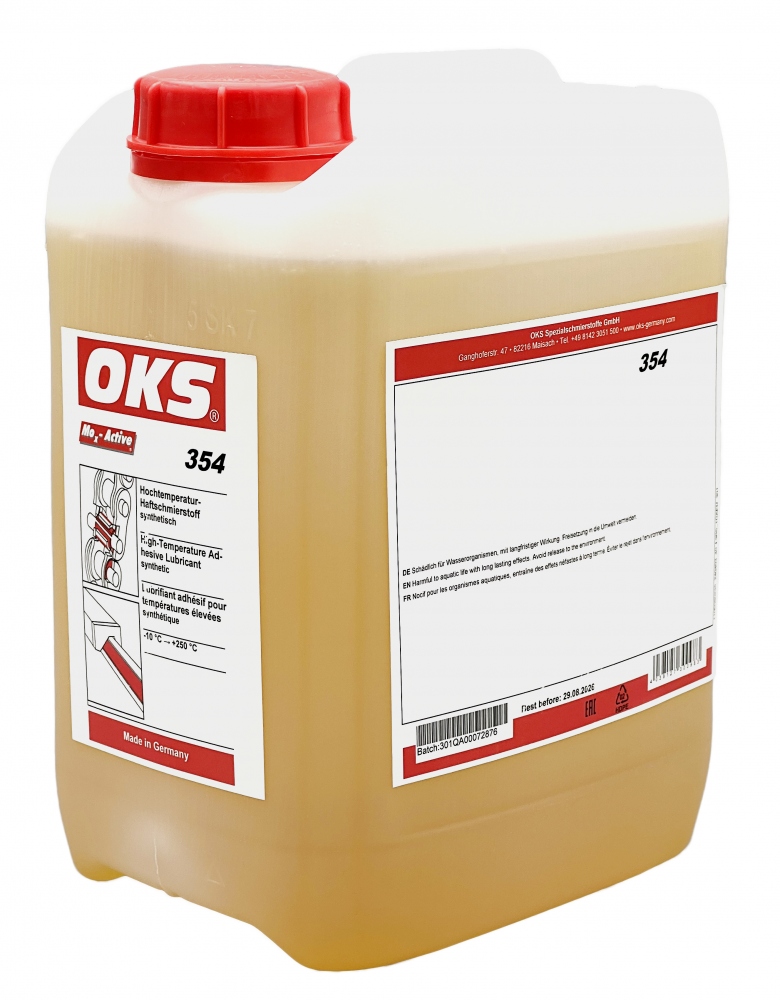 Non-soiling liquid lubricant for lubrication of machine elements at high temperatures or strong influence of waterField of applicationLubrication of chains, hinges, joints, ejector pins, clamping and drying frames or slideways at temperatures up to 250°C or under influence of water, for example conveying systems in painting, stoving, drying and cooling bed installationsPropertiesOutstanding oxidation propertiesResistant to water and steamGood creep propertiesOutstanding adhesion and lubrication effect with no tendency to dripNo formation of hard residuesExtreme wear protection through Moₓ-ActiveResistant to ultraviolet radiationTechnical DataTemperature range -10°C to +250°CDensity (20°C) 0.91 g/mlViscosity (40°C) 4,000 mm²/sFour-ball test rig (welding load) 2,200 NContent 5lCanisterIndustriesRail vehicle technologyMunicipal servicesIron and steel industryRubber and plastic processingLogisticsPaper and packaging industryChemical industryShipbuilding and marine technologyPlant and machine (tool) engineeringGlass and foundry industry Information on product safety (Manufacturer, Contact)OKS Spezialschmierstoffe GmbH, Ganghoferstr. 47, D-82216 Maisach-Gernlinden, +49 8142 3051 500, , www.oks-germany.com