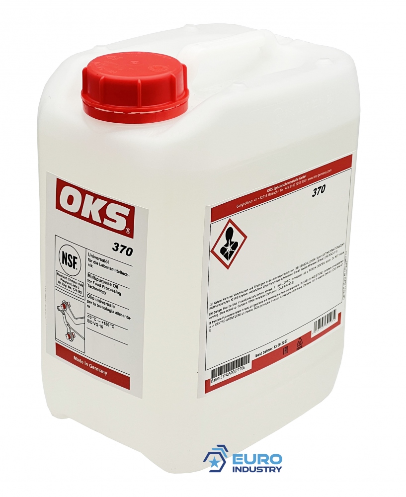 Colourless universal oil for food processing technology (NSF H1 registered)Field of applicationLubrication of valve seals, collars, O-rings, drives, piston rods and guidesLubrication of slides, slat-band and roller chainsLubrication of cutting knives as well as of needles and lifters of knitting machinesDismantling of rusted-in parts and removal of oil and greasy soilingPropertiesNSF H1 registeredHighly effective due to good creep propertiesBroad range of usesDisplaces waterOKS 370 is suitable for use with the OKS Airspray systemTechnical DataManufacturer number: 1106100235Temperature range -10°C to +180°CBase oil: white oilColour: colorlessViscosity class ISO VG: 15Viscosity (40°C): 14 mm²/sPour point 3°C step: -18°CFlashing point > 79: 195°CDensity (20°C): 0.88 g/mlSize: 5lPackaging type: canisterAlso available in: , 200l barrel and (OKS 371)IndustriesCatering equipment and food processing technologyRail vehicle technologyRubber and plastic processingIron and steel industryChemical industryShipbuilding and marine technologyLogisticsGlass and foundry industryMunicipal servicesPaper and packaging industryPlant and machine (tool) engineering Hazard Information (CLP)Signal Word: Danger.Hazard Statements (H-Sentences)H304: May be fatal if swallowed and enters airways.Precautionary Statements (P-Sentences)Reaction:Storage:Hazardous Components for LabelingP301 + P310: IF SWALLOWED: Immediately call a POISON CENTER/Doctor.P331: Do NOT induce vomiting.P405: Store locked up.White Mineral Oil (Petroleum) Information on product safety (Manufacturer, Contact)OKS Spezialschmierstoffe GmbH, Ganghoferstr. 47, D-82216 Maisach-Gernlinden, +49 8142 3051 500, , www.oks-germany.com