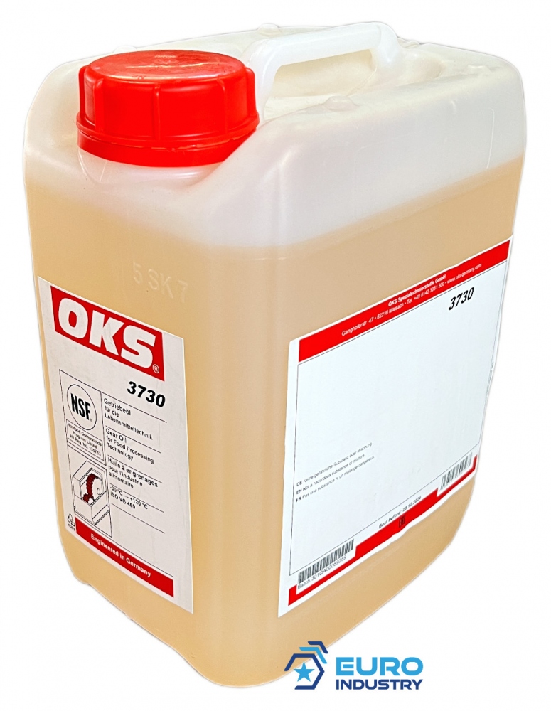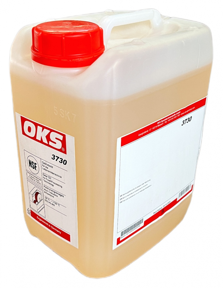 OKS 3730 Gear oil for the food industry 5l canister, ISO VG 460, NSF H1 registeredFully synthetic oil of the ISO VG class 460 for lubricating gears and other machine elements in the food processing technologyField of applicationLubrication of closed toothed gearinLiquid lubrication of chains, joints, guides, rolling and friction bearingsSuitable for immersion-bath, immersion-bath circulation and injection lubricationPropertiesGood ageing and oxidation stability through optimal additivesCold and hot water resistantResistant to water steam, disinfectants and cleaning agentsWide operating temperature rangeShear-stable and low-foamingGood wear protectionGood corrosion protectionLong economic operating timesMOSH-/MOAH-freeTechnical DataTemperature range -30°C to +120°CDensity (20°C) 0.86 g/mlViscosity (40°C) 460 mm²/sFZG damage level power level > 12NSF H1 registered, conforms to the requirements of the Hazard Analysis Critical Control Points (HACCP) method in the food processing industry, N° 135753Content 5lCanisterIndustriesCatering equipment and food processing technologyRail vehicle technologyMunicipal servicesIron and steel industryRubber and plastic processingLogisticsPaper and packaging industryChemical industryShipbuilding and marine technologyPlant and machine (tool) engineeringGlass and foundry industry