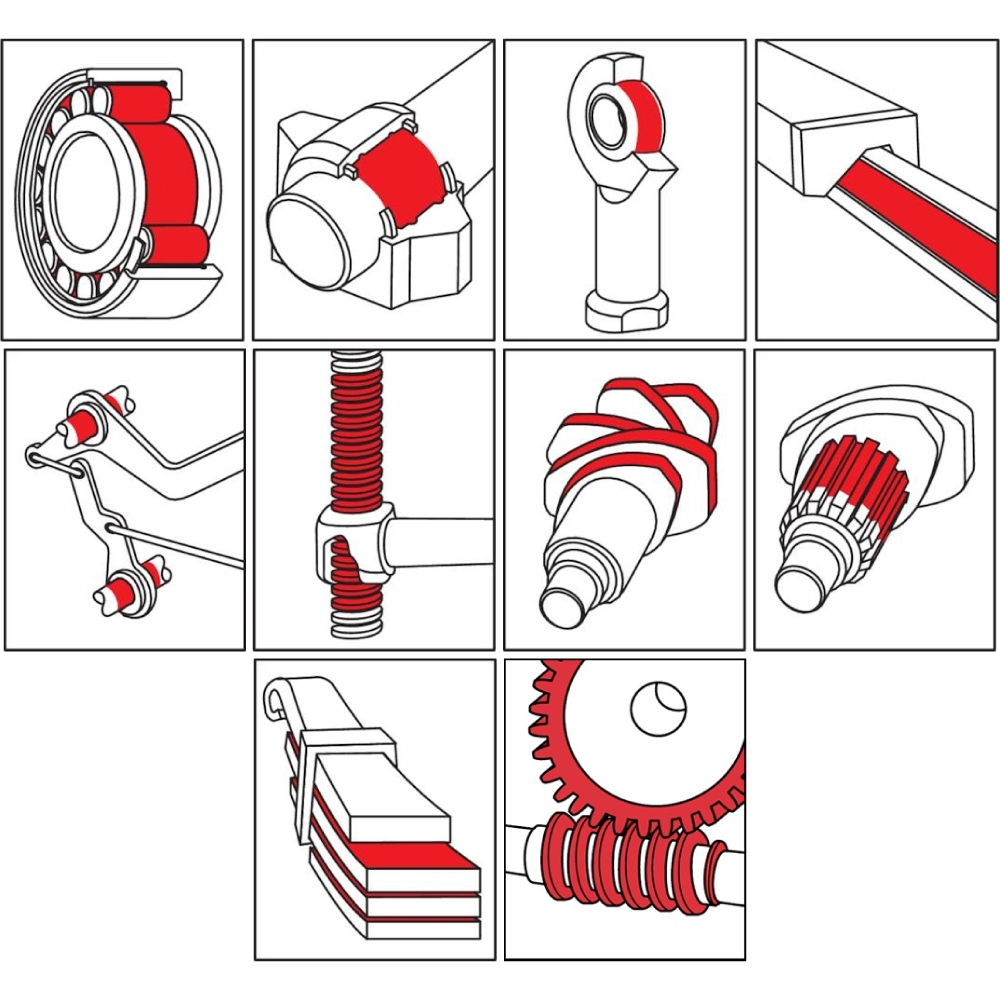 High-pressure long-life grease for lubrication points subjected to pressure or impacts also under outdoor exposureField of applicationGrease lubrication of unsheltered parts subject to heavy loading and/or impacts, such as friction, rolling and pivoting bearings, splined shafts, knockout spindles, threaded spindles and sliding surfaces of all kindsFor harsh operating conditionsPropertiesExcellently suited as a safety lubricating grease in mixed friction sector with especially good wear protectionEffectively protects against corrosionContains Mox-active to improve performanceTechnical DataOperating temperature -20°C until +130° CNLGI grade 2DN factor (dm x n) 500,000 mm/minBase oil viscosity (40°C) 185 mm²/sFour-ball test rig (welding load) 3,600 NContent 1kgTinIndustriesRail vehicle technologyMunicipal servicesIron and steel industryRubber and plastic processingLogisticsPaper and packaging industryChemical industryShipbuilding and marine technologyPlant and machine (tool) engineeringGlass and foundry industry