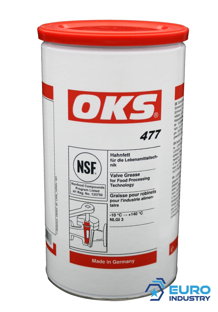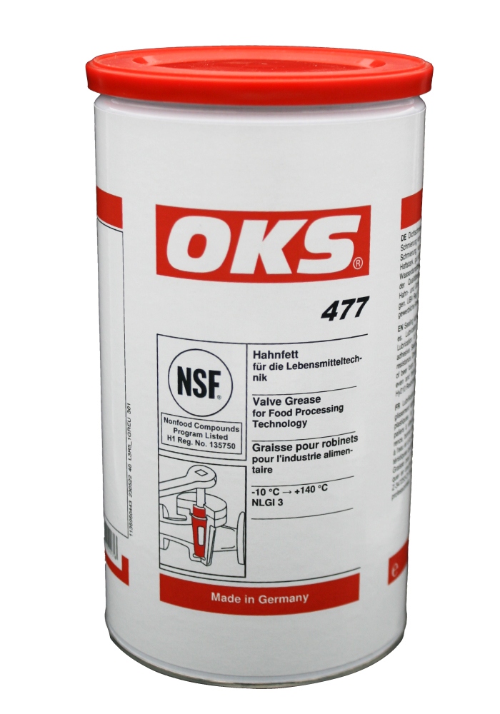 Valve grease for food processing technologyField of applicationSealing lubrication of sliding surfaces, e.g. ground-in parts such as taper plugs, dosing plungers, valves, beer taps etcMaintenance lubrication of plastic and rubber parts, as well as stuffing boxes, lip seals and O-ringsRolling and friction bearing lubrication in slow-running areas, toothing or chains on filling and packaging machines, stirring and grinding mechanisms etcPropertiesHighly effective due to proven lubricant formulalong-term lubricationResistant to hot and cold water, water vapour, wateryalkaline and acidic disinfectants and cleaning agentsNeither hard residues result, nor is there a tendency to soften or drip due to pasteurisation or sterilizationOdour and taste-free, and does not affect the properties of beer foamToxicologically harmless as defined in German LFGBTested according the UBA-guideline for the hygenic evaluation of lubricants in contact with potable waterTechnical DataOperating temperature -10°C until +140° CNLGI grade 3Base oil viscosity (40°C) 1,600 mm²/sNSF H1 registered 135 750Content 1kgTinIndustriesCatering equipment and food processing technologyRail vehicle technologyMunicipal servicesIron and steel industryRubber and plastic processingLogisticsPaper and packaging industryChemical industryShipbuilding and marine technologyPlant and machine (tool) engineeringGlass and foundry industry Information on product safety (Manufacturer, Contact)OKS Spezialschmierstoffe GmbH, Ganghoferstr. 47, D-82216 Maisach-Gernlinden, +49 8142 3051 500, , www.oks-germany.com