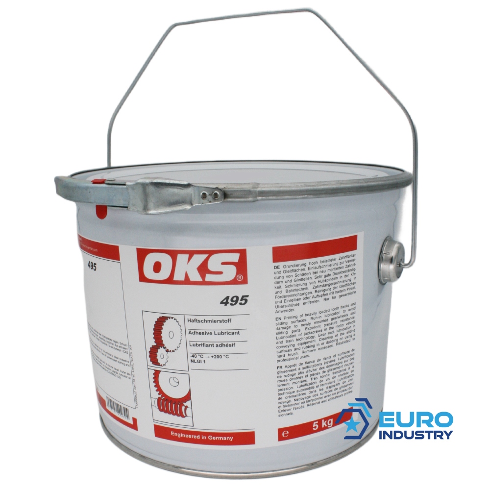 OKS 495 is an adhesive lubricant for priming and continuous lubrication of heavily loaded tooth flanks and sliding surfaces.Field of applicationLubrication of tooth flanks and sliding surfaces of machine elements of all types, for example sliding bearings, slideways, guides, etc.Run-in lubrication of heavily loaded tooth flanks and sliding surfacesLubrication of jackscrews in the motor vehicle and train technologyCable lubricationPropertiesHigh effectiveness thanks to graphite shareExtremely low friction at highest loadIncreased operational reliability of moving parts due to run-in-supporting formation of sliding filmMinimum consumption due to realisable thin-film lubricationExcellent pressure resistanceWaterproofFree of bitumen, solvents, heavy metals and chlorineTechnical DataBase oil: synthetic oilBase oil: mineral oilThickener: aluminium-complex soapSolid lubricants: graphiteAdditives: EP additivesOperating temperature: -40°C until +200° CNLGI grade: 1Base oil viscosity (40°C): 500 mm²/sFour-ball test rig (welding load): 4,200 NFZG damage level power level > 12Colour: blackSize: 5kg Packaging type: bucketAlso available in: , IndustriesRail vehicle technologyMunicipal servicesIron and steel industryRubber and plastic processingLogisticsPaper and packaging industryChemical industryShipbuilding and marine technologyPlant and machine (tool) engineeringGlass and foundry industry Hazard Information (CLP)Signal word: Warning.Hazard Statements (H-Codes)H317: May cause an allergic skin reaction.Precautionary Statements (P-Codes)Prevention:P272: Contaminated work clothing should not be allowed out of the workplace.P280: Wear protective gloves.Response:P302 + P352: IF ON SKIN: Wash with plenty of soap and water.P333 + P313: If skin irritation or rash occurs: Get medical advice/attention.P362 + P364: Take off contaminated clothing and wash it before reuse.Hazardous Components:Polysulfides, di-tert-dodecyl Information on product safety (Manufacturer, Contact)OKS Spezialschmierstoffe GmbH, Ganghoferstr. 47, D-82216 Maisach-Gernlinden, +49 8142 3051 500, , www.oks-germany.com