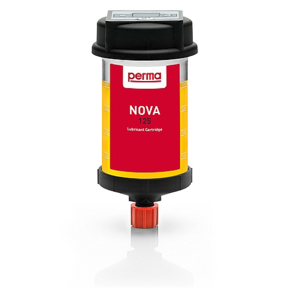 Perma NOVA LC125 Lubricant cartridge with SO69 | N° 110293Perma Bio oil, high viscosity SO69Multi-purpose oilRapidly biodegradableWater hazard class 1Meet CLP requirementsExcellent viscosity-temperature relationGood antiwear behaviorVery adhesiveFZG test A/8.3/90 scuffing load stage ≥ 12Technical specificationsBase oil: esterISO VG DIN 51519: 320Cinematic oil viscosity, DIN 51561,at 40 °C, mm²/s: 320at 100 °C, mm²/s: 34Colour: orangeDensity, DIN 51757, at 20 °C, g/cm3 approx.: 0,95Viscosity index, DIN ISO 2909: > 160Pourpoint, DIN ISO 3016, °C: < -20Service temperature range, °C: – 20 to 110ApplicationsPerma Bio oil, high viscosity SO69 is used for the lubrication of open drive and conveyor chains, spindles and joints as well as for spur, bevel and worm gears and pertinent machine elements, such as couplings, plain and rolling bearings.Perma Bio oil, high viscosity SO69 is used in agricultural and forestry equipment, water treatment installationsPerma NOVA Lubrication systemsPerma NOVA can be used in all application areas from -20 °C to +60 °C.A discharge period from 1 to 12 months can be entered via the setting button on the NOVA Control unit.The control unit then calculates the required quantity of gas for constant and reliable discharge while taking into account the ambient temperature.Perma NOVA consists of a reusable control unit, a NOVA LC filled with grease or oil and a protective cover.NOVA LC is available in 65 cm³ and 125 cm³. Information on product safety (Manufacturer, Contact)perma-tec GmbH & Co. KG, Hammelburger Str. 21, 97717 Euerdorf, Deutschland, +49 9704 609-0,