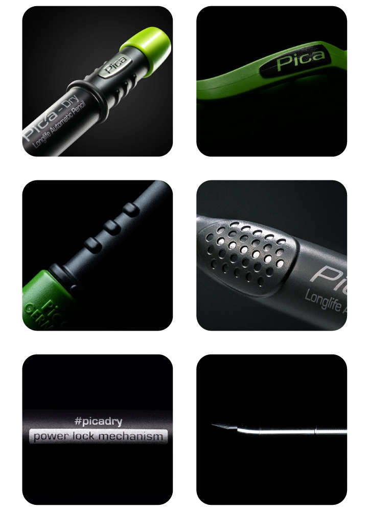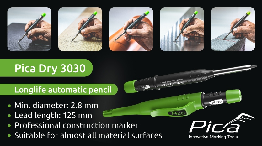 Pica Dry 3030 – Longlife automatic pencilThe Pica Dry is the professional construction marker and is suitable for almost all material surfaces. Whether dry or wet, smooth or rough, dusty or rusty, thanks to the extensive range of leads, you are perfectly equipped for any project.About the markerShaft with roll stopPractical holster with special clip for perfect one-hand operationPatented integrated sharpener in holster for instant precisionHigh-tech push mechanism for automatic lead feed in stainless steel tubeRefills can be conveniently refilled from behindMin. diameter: 2.8 mmLead length: 125 mmAbout the leadsFor All Graphite 2B lead marks on almost all surfaces, whether dry, damp, smooth, rough or dustyWide range of applications: for light/dark surfaces, water-soluble & waterproofCan be wiped off with a damp cloth from smooth surfacesJoiner leads in hardness H enable fine markings on dry surfacesWaterproof summer mines are stable up to 70°C Information on product safety (Manufacturer, Contact)Pica-Marker GmbH, Picastrasse 5, 91356 Kirchehrenbach, GERMANY, +49 9191 320 403-0, , www.pica-marker.com