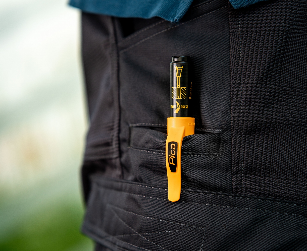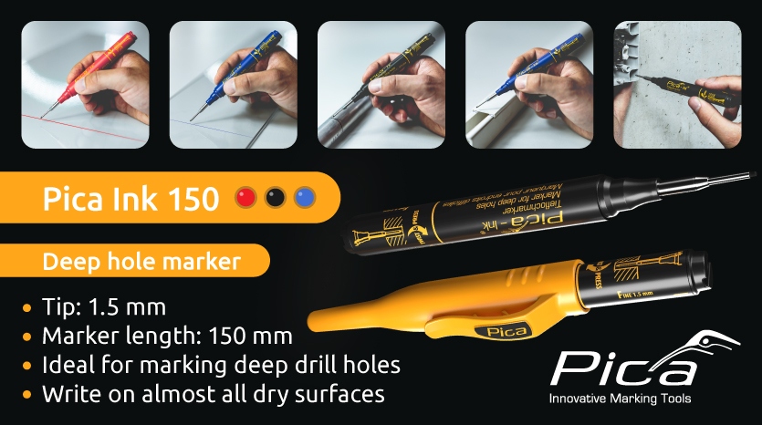 Pica Ink 150 – Deep hole markerThe Pica Ink is the original Deep Hole Marker. Its quick-drying ink writes on almost all dry surfaces and its long tip is ideal for marking deep drill holes.About the markerPractical holster with special clip for perfect one-hand operationSelf-adjusting, patented stainless steel telescopic tip enables up to 3 times the writing performanceTwist & Revive: nib can be reinserted several times with a 180° turn to revive the markerInk refill set for refillingTip: 1.5 mmMarker length: 150 mmAbout the inkPermanent alcohol-based ink, removable with alcohol/spirit from smooth surfacesWrites on almost all dry surfacesInstantly water and abrasion resistantRich color contrast Information on product safety (Manufacturer, Contact)Pica-Marker GmbH, Picastrasse 5, 91356 Kirchehrenbach, GERMANY, +49 9191 320 403-0, , www.pica-marker.com