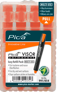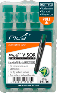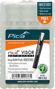 Water resistant “MULTI-USE” marking crayon. In the clever “Easy-Refill-Pack”. To refill the Pica VISOR permanent Longlife Industrial Marker. For water resistant marking on almost all material surfacesNever dries outFull performance at all times, from the first to the very last lineMost economic: 1 lead substitutes up to 5 conventional ink or paint markersMost environment-friendly due to low consumption and refill ability within secondsLead diameter: 10 mm, length: 85 mmAvoid lead temperature over 40° C Information on product safety (Manufacturer, Contact)Pica-Marker GmbH, Picastrasse 5, 91356 Kirchehrenbach, GERMANY, +49 9191 320 403-0, , www.pica-marker.com
